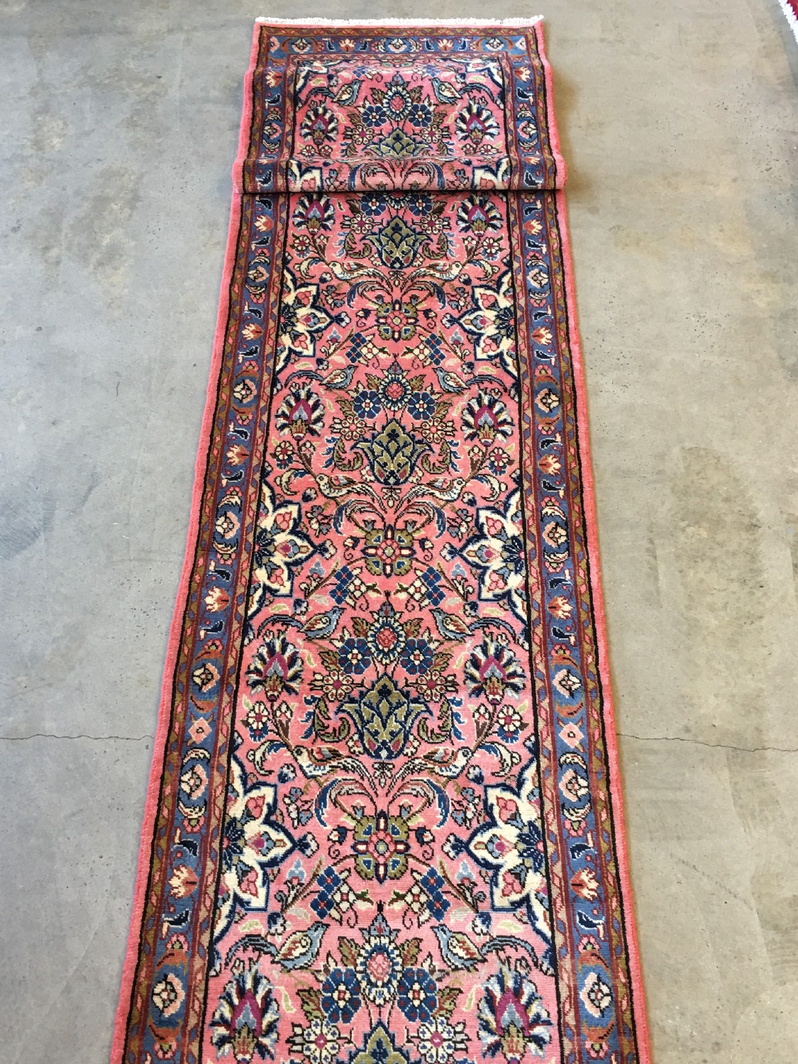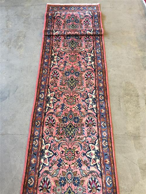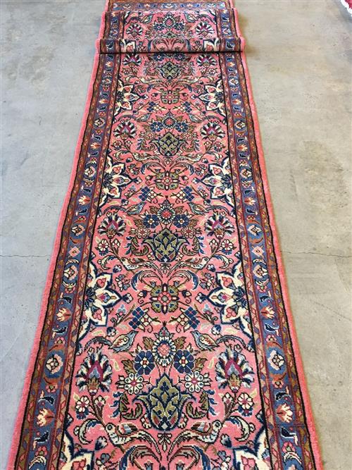 FABULOUS PERSIAN MEHRABAN RUNNER, 100% PLUSH WOOL GLOSSY PILE. SOLID AND DENSE, HAND- KNOTTED WEAVE WITH TRADITIONAL DESIGN OF ALL OVER FLORAL MEDALLIONS OF PEONIES, PALMETTES AND LILY MOTIFS. QUARTERED CORNER MEDALLIONS OF HALF FLORAL SPRAYS ON A SOFT ROSE FIELD, WITH BLUE BIRDS ON TREE BRANCHES, ARABESQUE SAZ LEAVES. SIZE: 375 X 80 CM ORIGIN: PERSIA - RRP: $3,900 CONDITION: EXCELLENT, EX GALLERY DOCUMENTATION OF AUTHENTICITY INCLUDED.