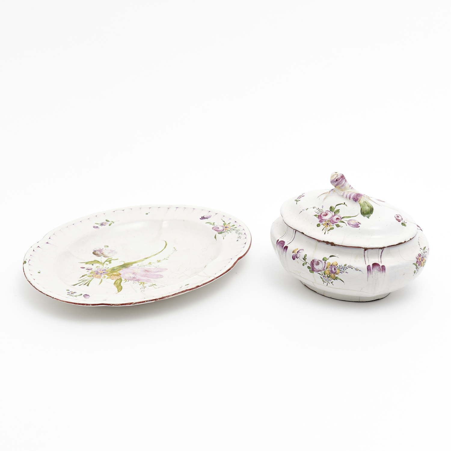 A FRENCH FAIENCE TUREEN WITH COVER AND STAND (A/F) L.21CM (STAND), LEONARD JOEL DELIVERY SIZE: SMALL