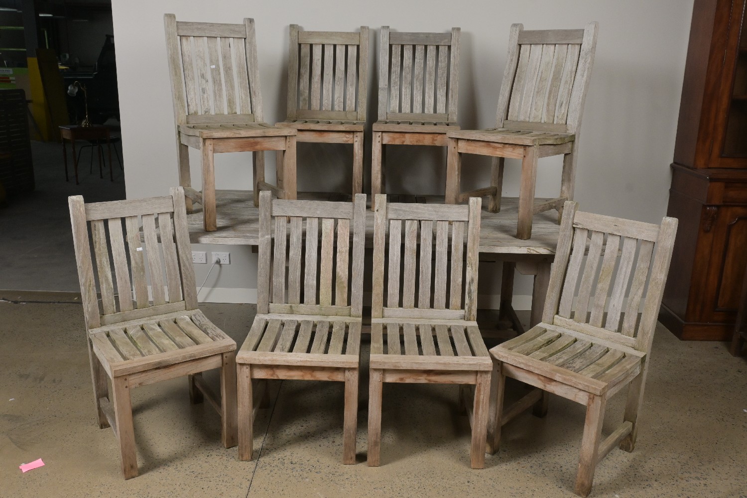 A TEAK NINE PIECE OUTDOOR SETTING (A/F) (76H X 216W X 120D CM) (PLEASE NOTE THIS HEAVY ITEM MUST BE REMOVED BY CARRIERS AT THE CUSTOMER'S EXPENSE. LEONARD JOEL STAFF CANNOT ASSIST CARRYING THIS ITEM) (X-LARGE)