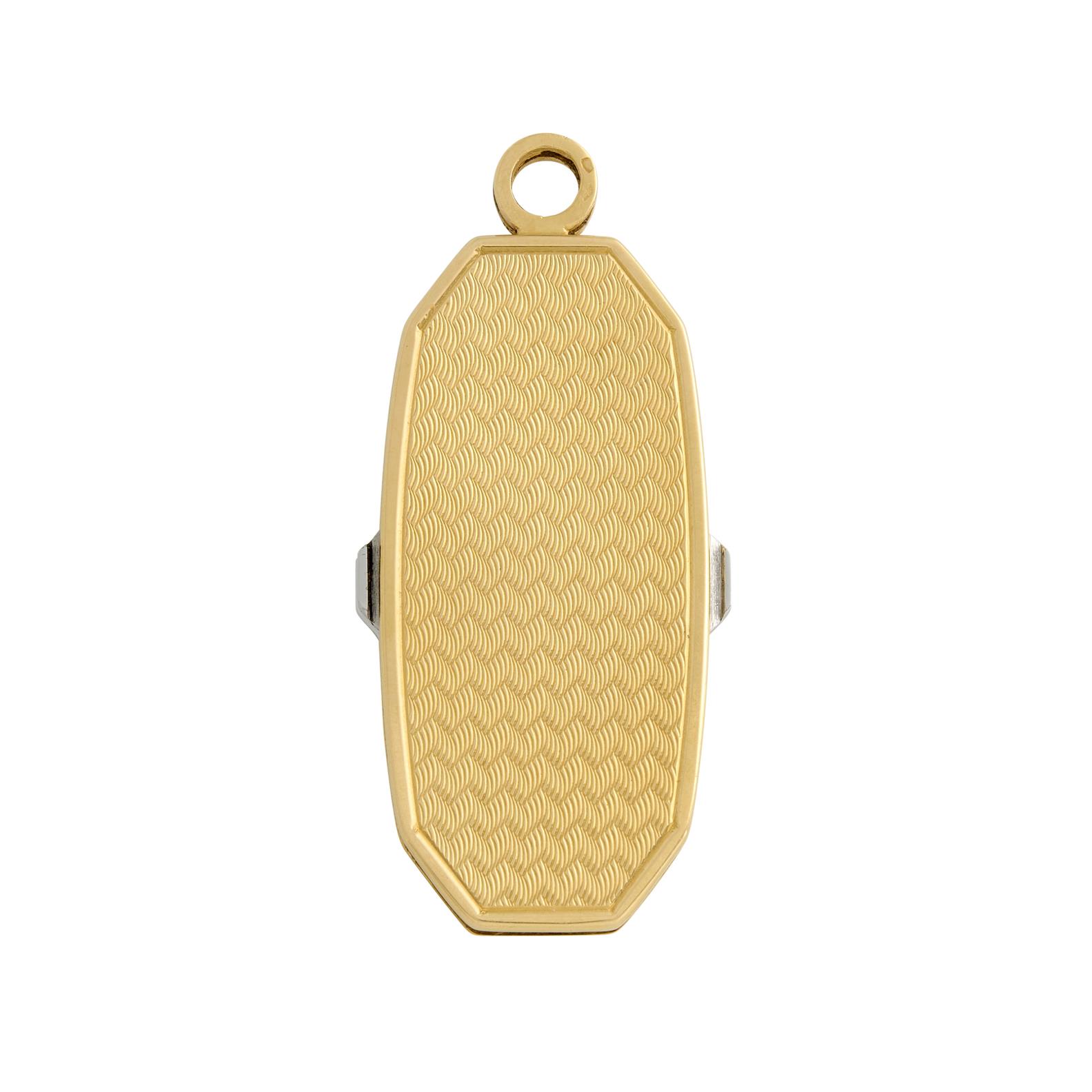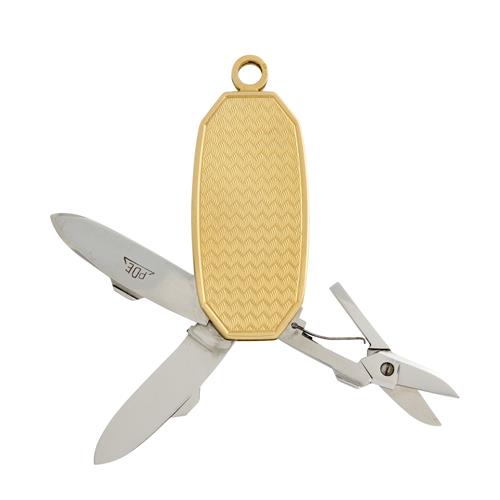 Containing a stainless steel knife, file and scissors, encased in a textured 18ct gold sleeve, length 59mm, width 27mm, gross weight approximately 34 grams, indistinct hallmarks.