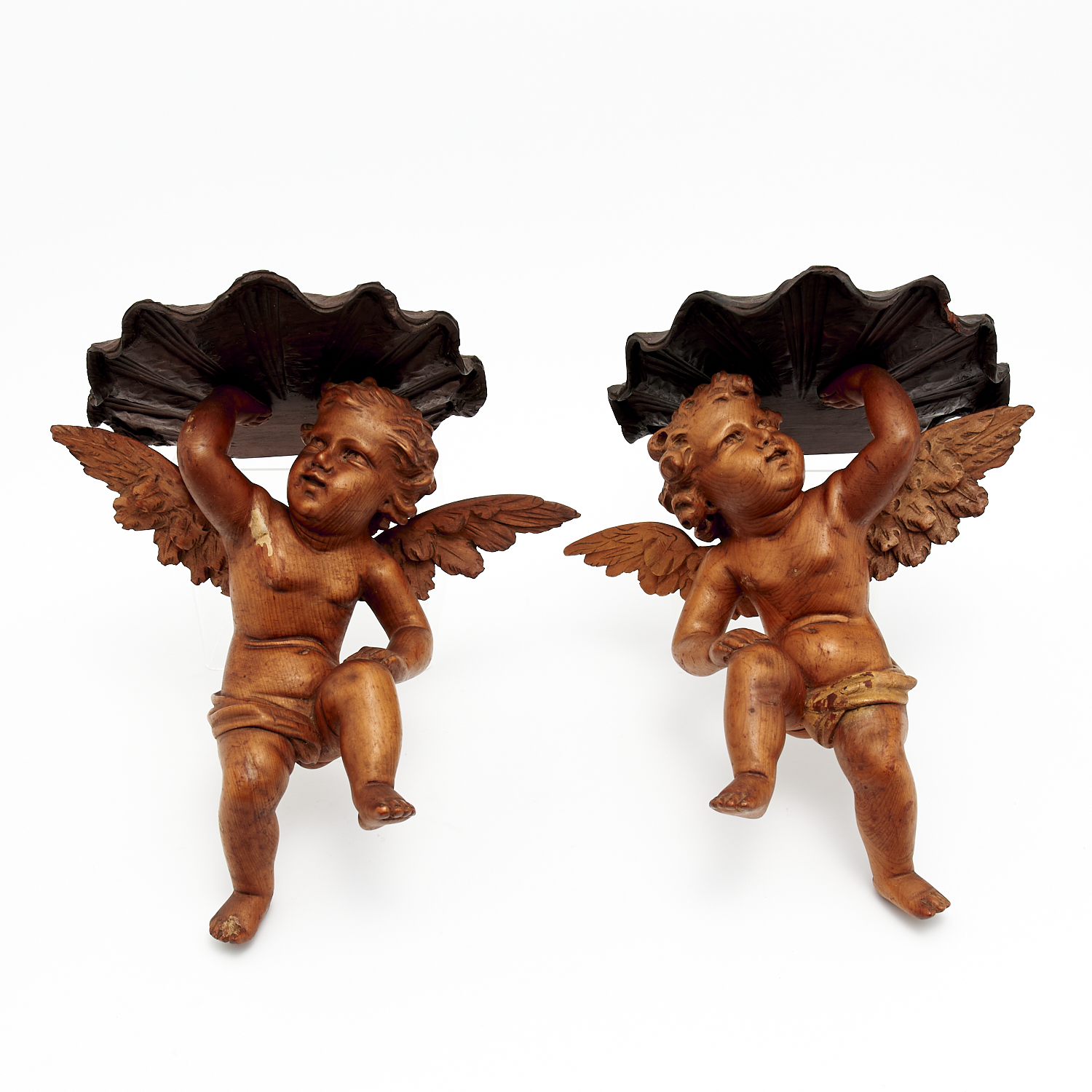 A PAIR OF FRENCH ANTIQUE CARVED PINE PUTTI FORM SHELF BRACKETS H.31CM, LEONARD JOEL DELIVERY SIZE: MEDIUM