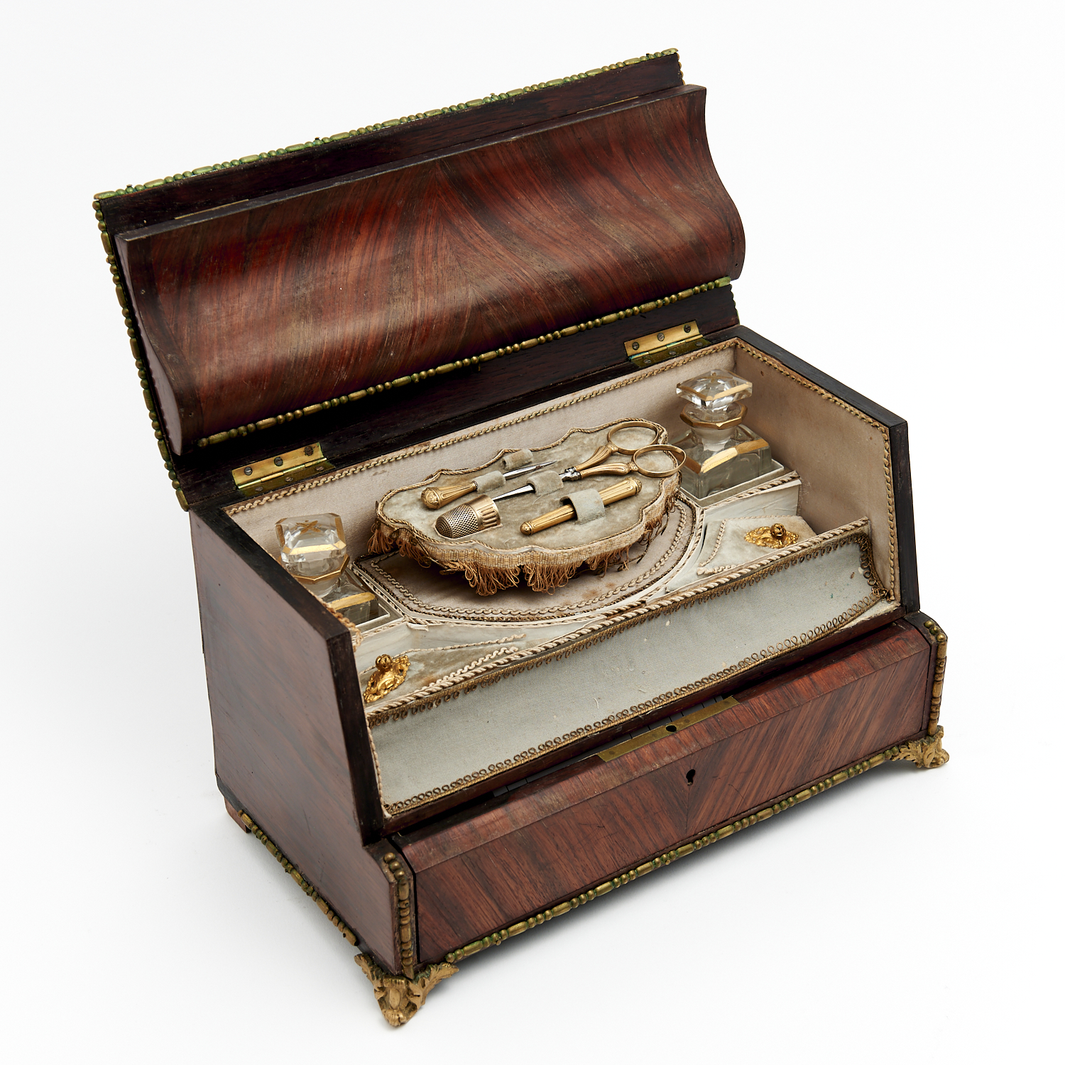 A MID-19TH CENTURY ANTIQUE SEWING AND PERFUME CABINET WITH GILDED BRASS BEADING (A/F), L.29.5CM, LEONARD JOEL DELIVERY SIZE: MEDIUM