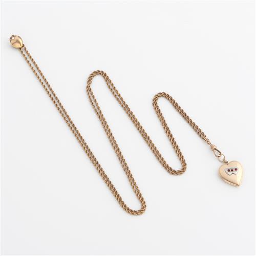 A VINTAGE SEED PEARL SET SLIDE AND GUARD CHAIN IN GOLD PLATE TO A HEART LOCK IN 9CT GOLD LINE SILVER, APPOXIMATELY 1200MM