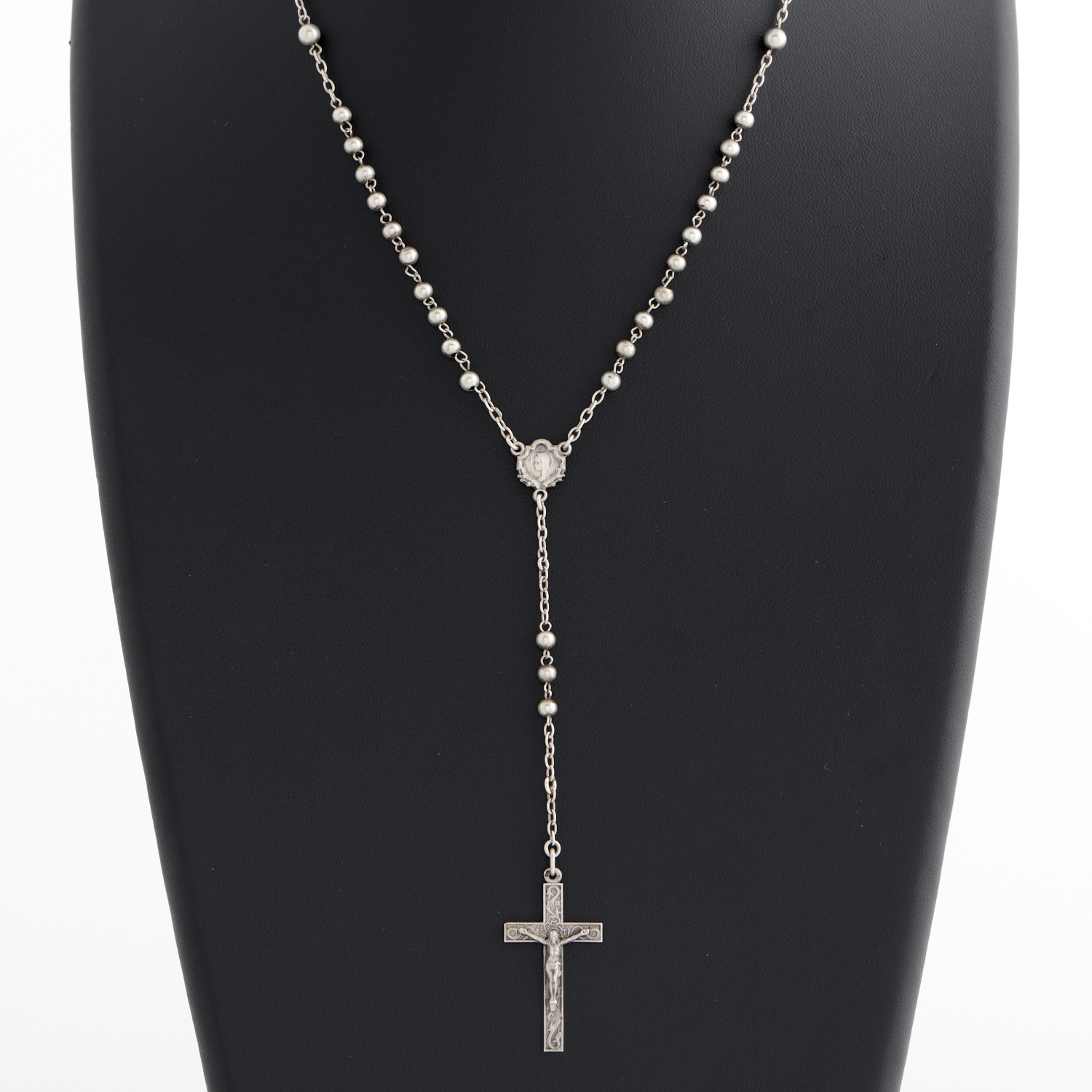 A VINTAGE FRENCH ROSARY IN SILVER, CROSS MEASUREMENT 30 X 17MM, A/F