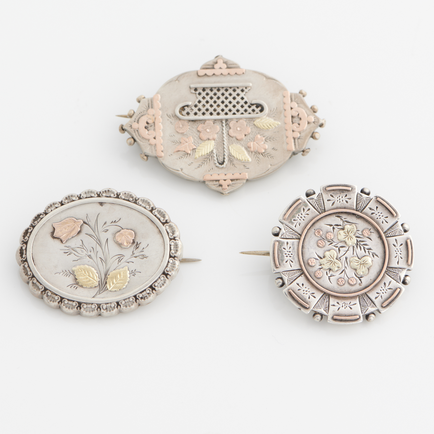 A COLLECTION OF VICTORIAN BROOCHES IN STERLING SILVER WITH 9CT GOLD DETAIL
