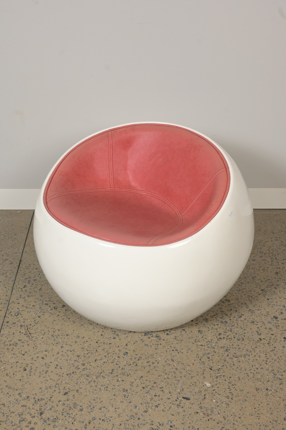 A FIBREGLASS BALL SHAPED SEAT WITH RED LEATHER UPHOLSTERY (A/F) (56H X 71W X 72D CM) (LEONARD JOEL DELIVERY: LARGE)