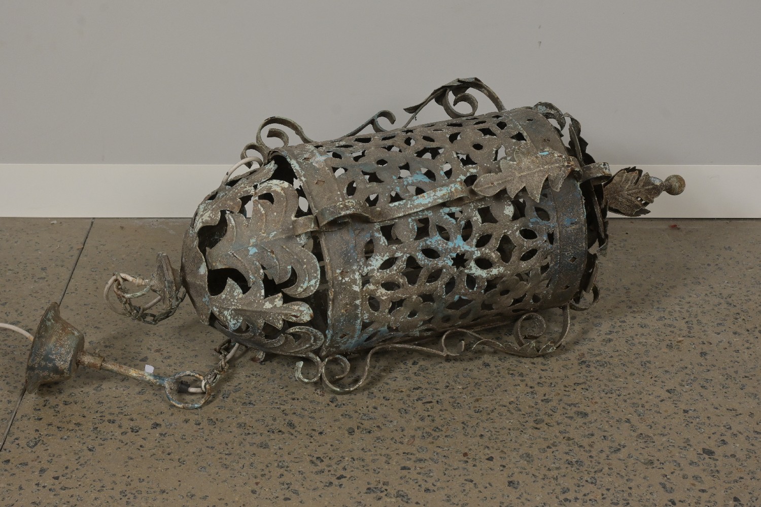 AN EARLY 20TH CENTURY FRENCH WROUGHT IRON HANGING LIGHT (85H X 34DIA CM) (LEONARD JOEL DELIVERY: LARGE)