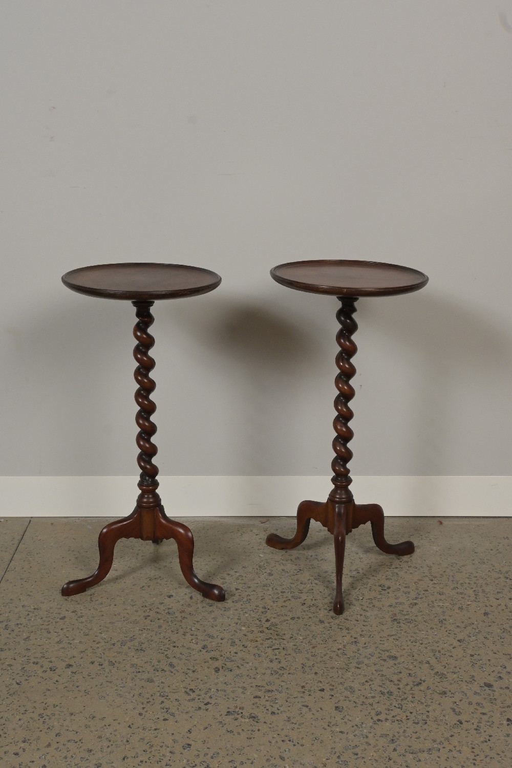A PAIR OF GEORGIAN MAHOGANY BARLEY TWIST STEM WINE TABLES (64H X 35DIA CM) (LEONARD JOEL DELIVERY: MEDIUM)