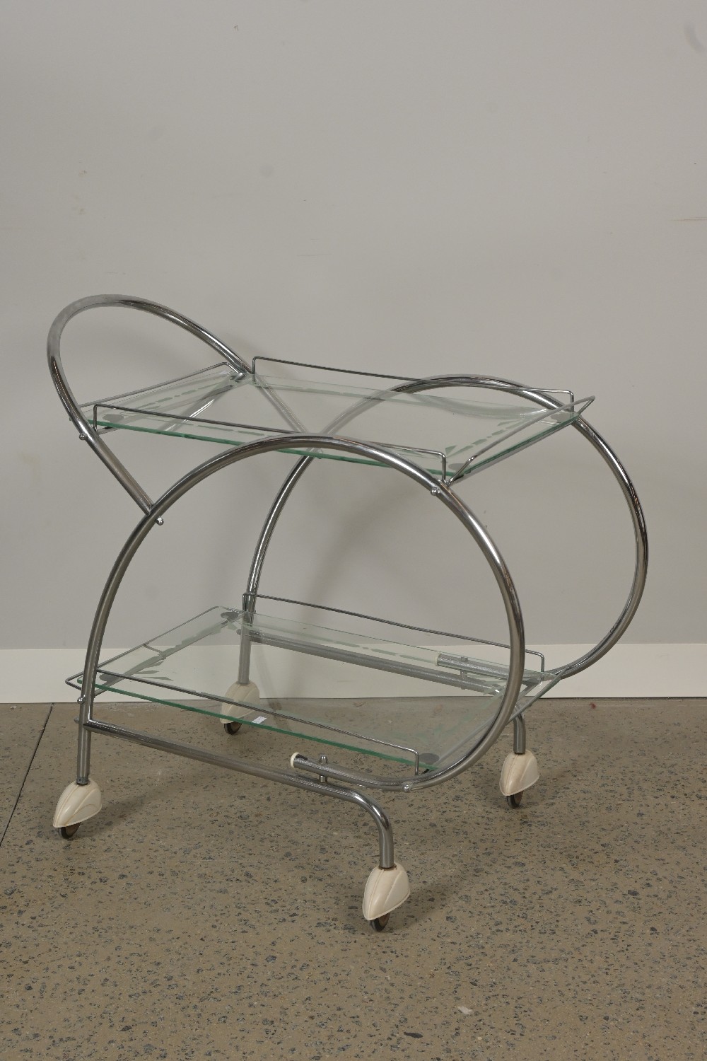 AN ART DECO, CHROME, AND ETCHED GLASS, TWO TIER AUTO TROLLEY WITH BAKELITE CASTOR COVERS (77H X 80W X 45D CM) (LEONARD JOEL DELIVERY: LARGE)
