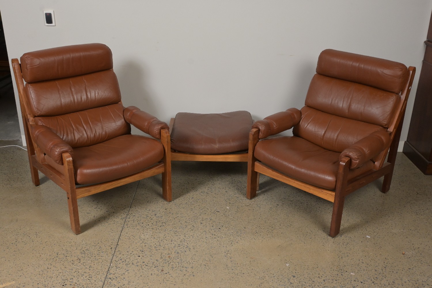 A PAIR OF AUSTRALIAN MADE BLACKWOOD AND LEATHER ARMCHAIRS WITH MATCHING OTTOMAN (96H X 80W X 83D CM) (LEONARD JOEL DELIVERY: X-LARGE)