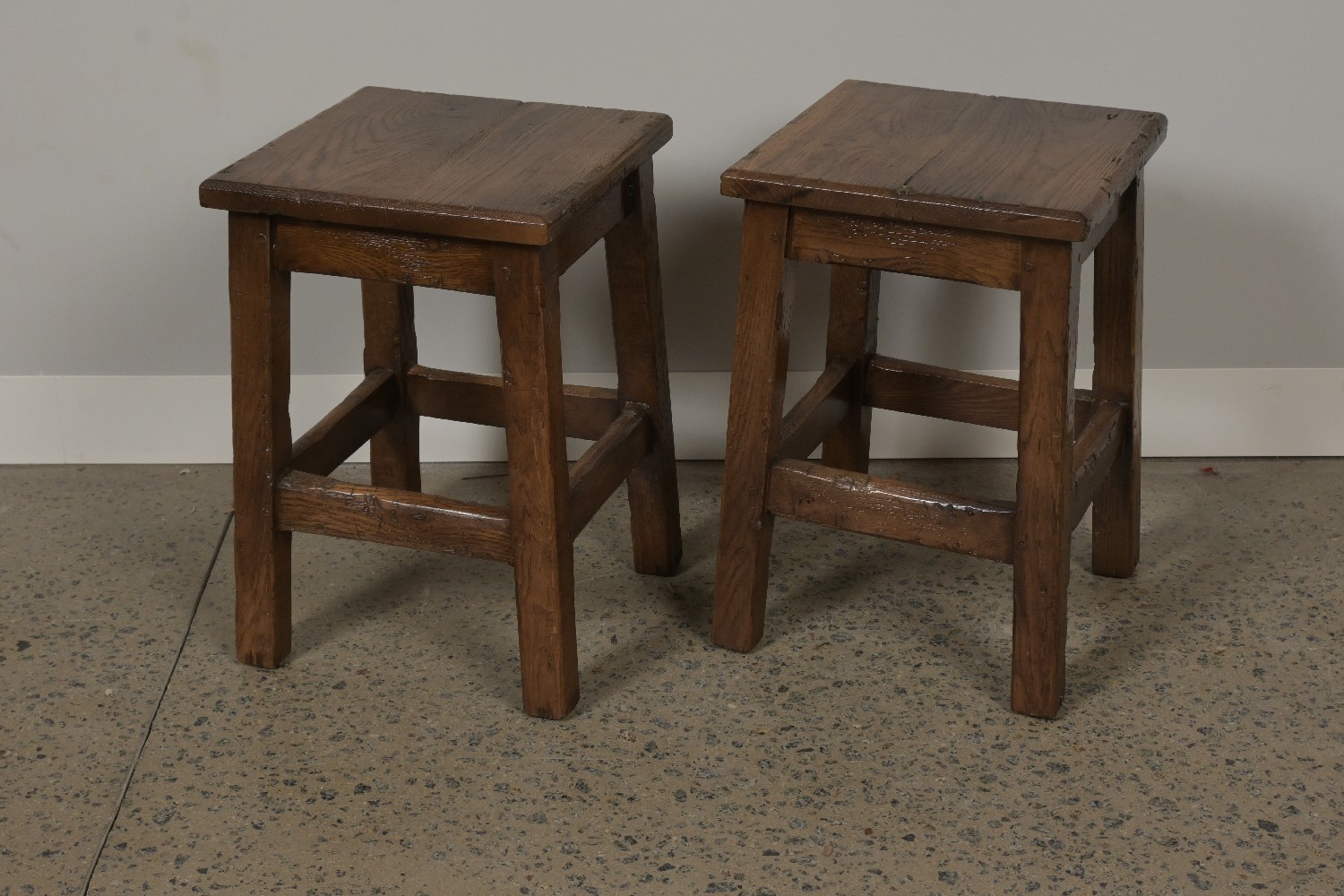 A PAIR OF FRENCH STYLE SQUARE OAK JOINT STOOLS (45H X 31W X 31D CM) (LEONARD JOEL DELIVERY: LARGE)