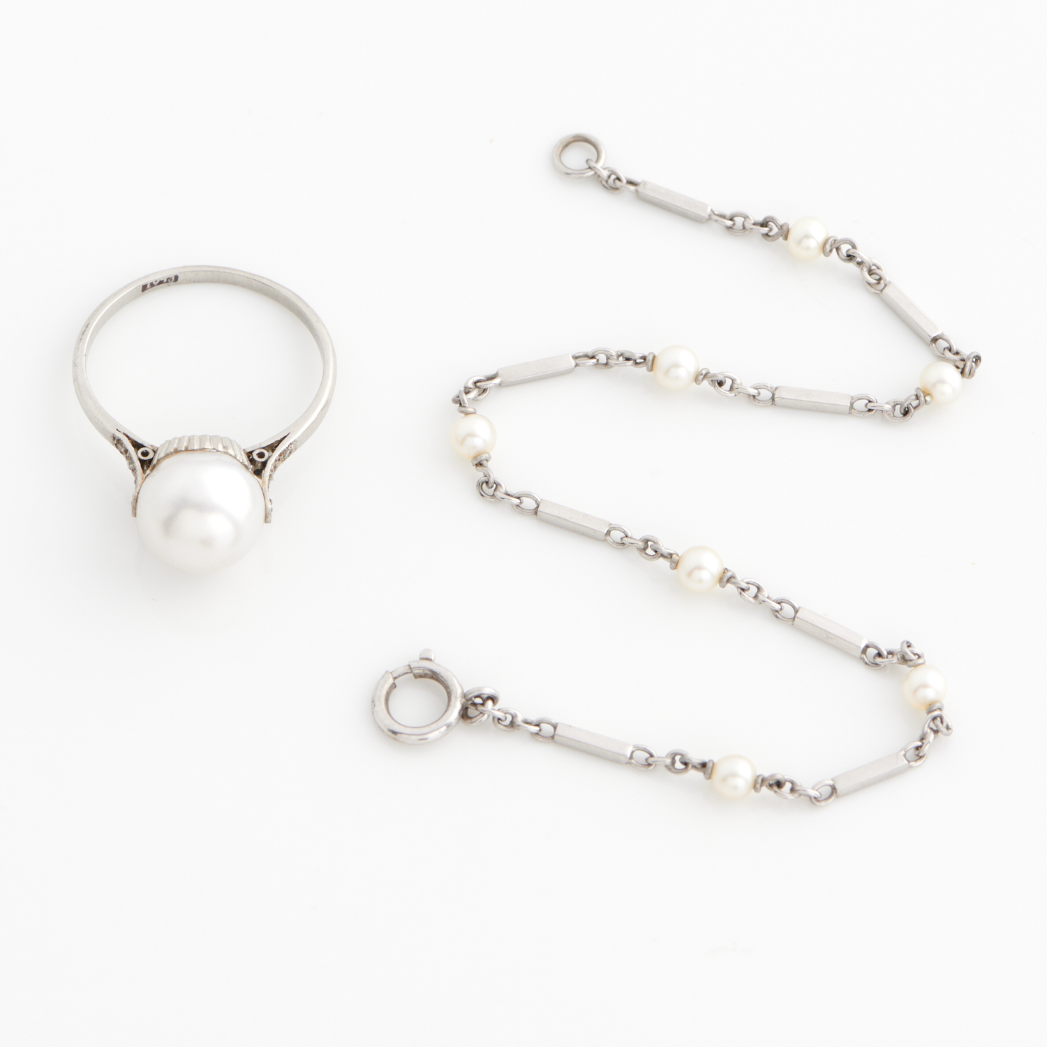 A PEARL RING IN SILVER, TOGETHER WITH A PEARL BRACELET IN SILVER, RING SIZE P 1/2, THE BRACELET 185MM