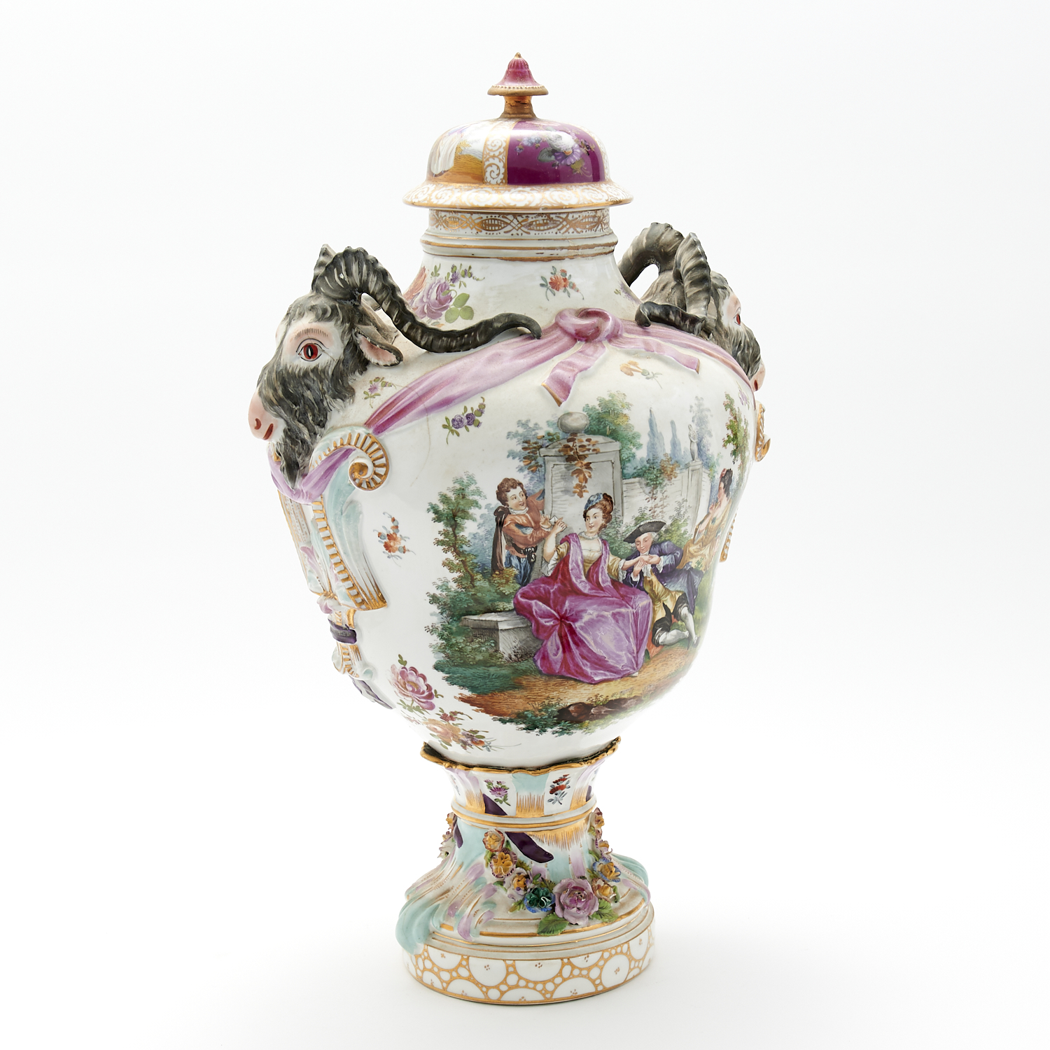 A LARGE CONTINENTAL HAND PAINTED URN WITH COVER APPLIED WITH GOAT HEADS (A/F) H.55.5CM, LEONARD JOEL DELIVERY SIZE: LARGE
