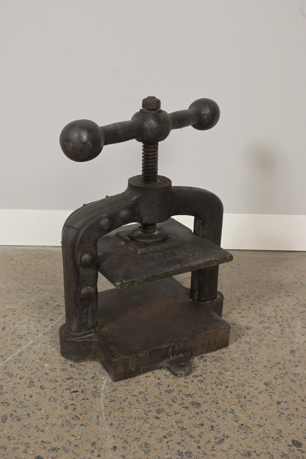 A VICTORIAN CAST IRON BOOKPRESS (48H X 42W X 29D CM) (PLEASE NOTE THIS HEAVY ITEM MUST BE REMOVED BY CARRIERS AT THE CUSTOMER'S EXPENSE. LEONARD JOEL STAFF CANNOT ASSIST CARRYING THIS ITEM) (X-LARGE)