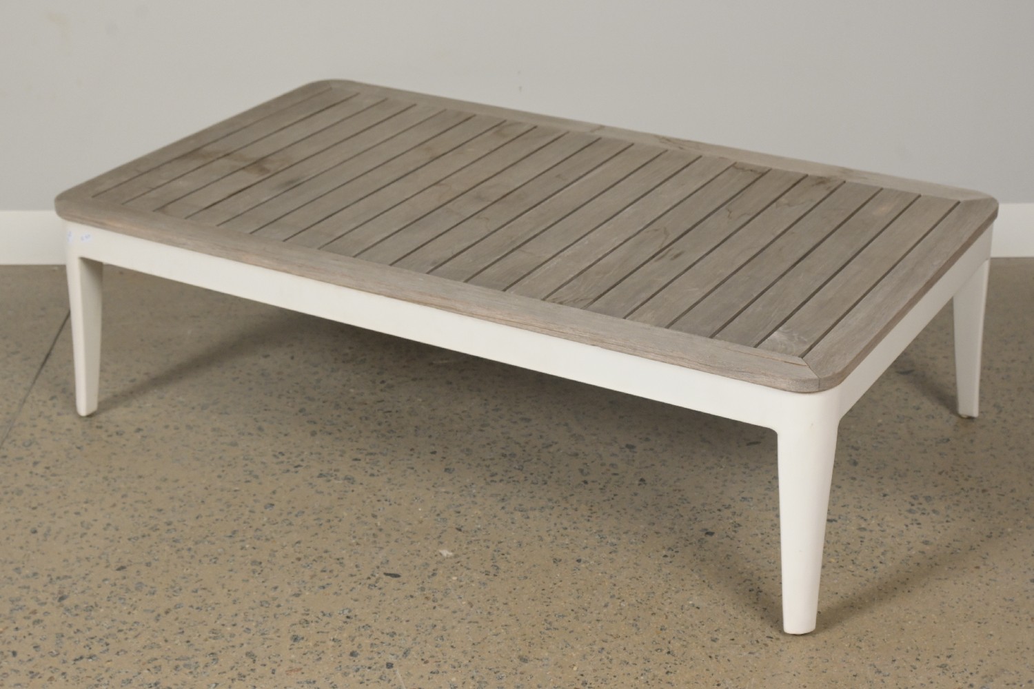 AN OUTDOOR TABLE WITH TEAK TOP AND WHITE METAL LEGS 35H X 117W X 68D CM) (LEONARD JOEL DELIVERY: LARGE)