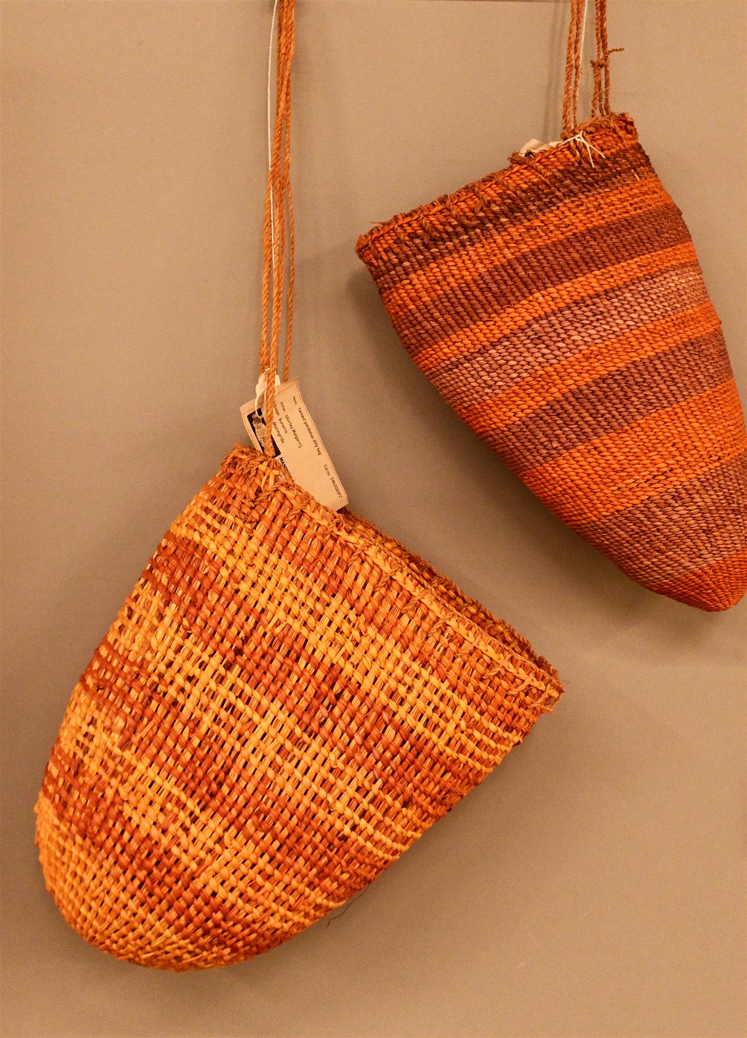 TWO DILLY BAGS BY SHIRLEY MALGARRY AND NANCY JIN.MALIBA, WOVEN TWINE (2), ARTISTS' NAMES AND CATALOGUE NUMBERS INSCRIBED ON MANINGRIDA LABELS ATTACHED, LARGEST MEASURING 34 X 29CM