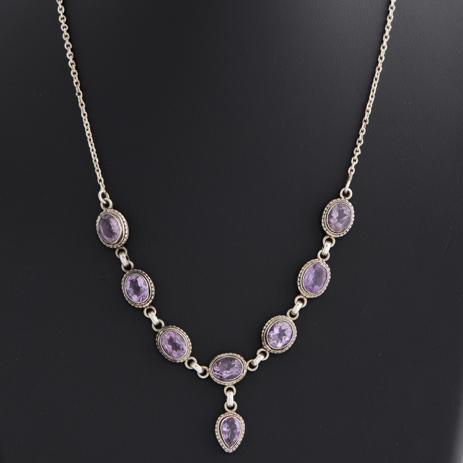 A VINTAGE AMYTHEST NECKLACE IN SILVER, 440MM