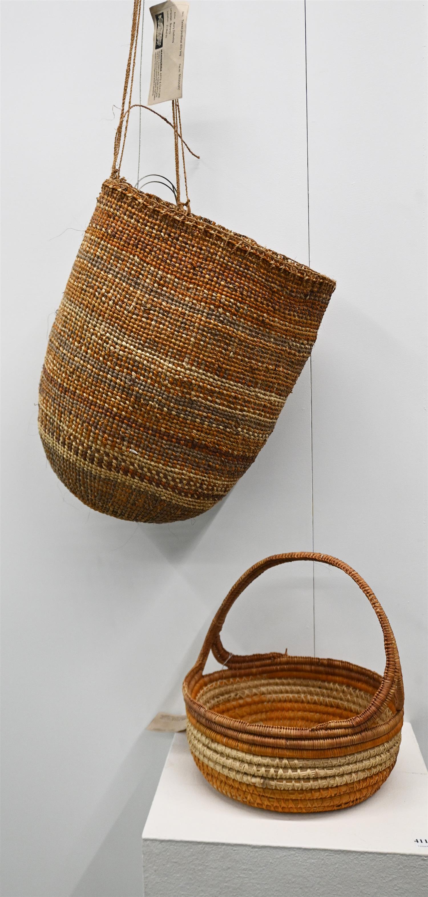DILLY BAG AND COILED BASKET BY MARY JADBALAG AND SERENA GUBUYANI, WOVEN TWINE AND COILED PANDANUS (2), ARTISTS' NAMES AND CATALOGUE NUMBERS INSCRIBED ON MANINGRIDA LABELS ATTACHED, LARGEST MEASURING 35 X 32CM