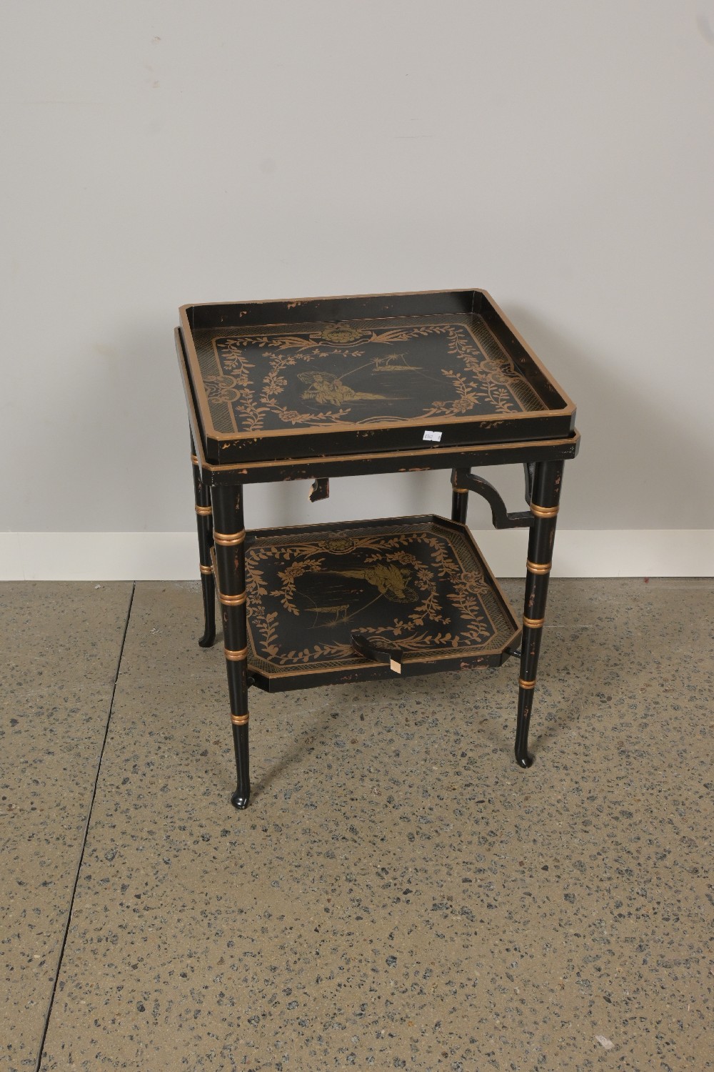 AN EARLY 20TH CENTURY CHINOISERIE LACQUERED TRAY ON STAND (A/F) (60H X 50W X 44D CM) (LEONARD JOEL DELIVERY: LARGE)