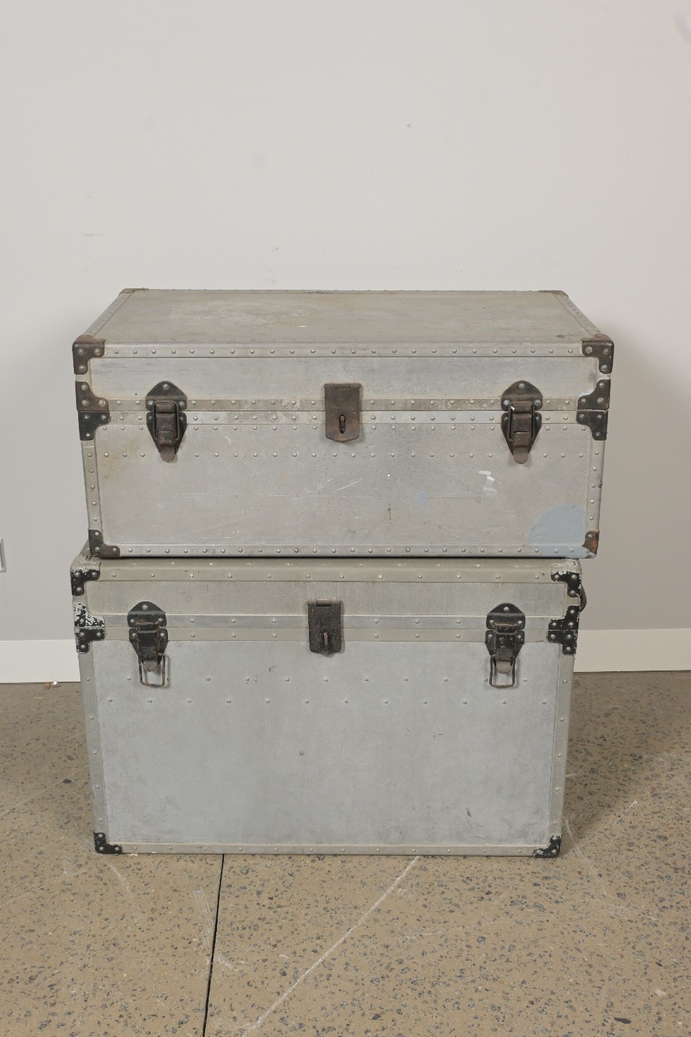 TWO VINTAGE INDUSTRIAL ALUMINIUM TRAVELLING TRUNKS (A/F) (55H X 79W X 35D CM) (PLEASE NOTE THIS HEAVY ITEM MUST BE REMOVED BY CARRIERS AT THE CUSTOMER'S EXPENSE. LEONARD JOEL STAFF CANNOT ASSIST CARRYING THIS ITEM) (X-LARGE)