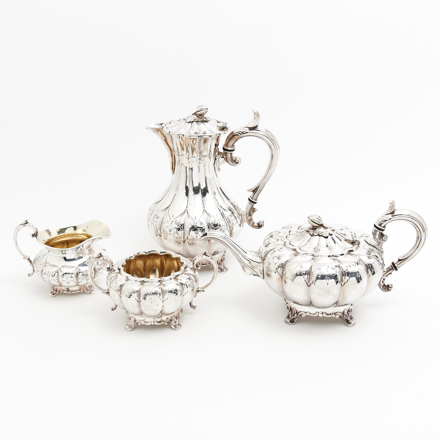A SILVERPLATE 1967 EASTER CUP FOUR PIECE TROPHY SET COMPRISING A MELON FORM COFFEE POT, TEA POT, SUGAR BOWL AND CREAMER H.25CM (TALLEST), LEONARD JOEL DELIVERY SIZE: MEDIUM
