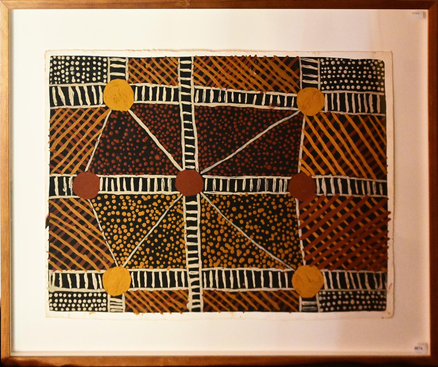 DELILAH FREDDY PURUNTATAMERI, UNTITLED, NATURAL EARTH PIGMENTS ON PAPER, ALCASTON GALLERY STAMP AND CAT NO. AK9943 VERSO, 54 X 73CM, FRAME SIZE: 77 X 95CM