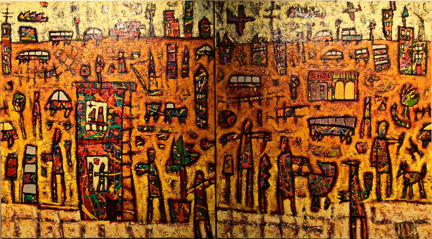 BRUCE EARLES, SANCTUARY 2001, ACRYLIC ON CANVAS, DIPTYCH, SIGNED AND DATED ON LOWER RIGHT PANEL, 112 X 204CM (OVERALL)