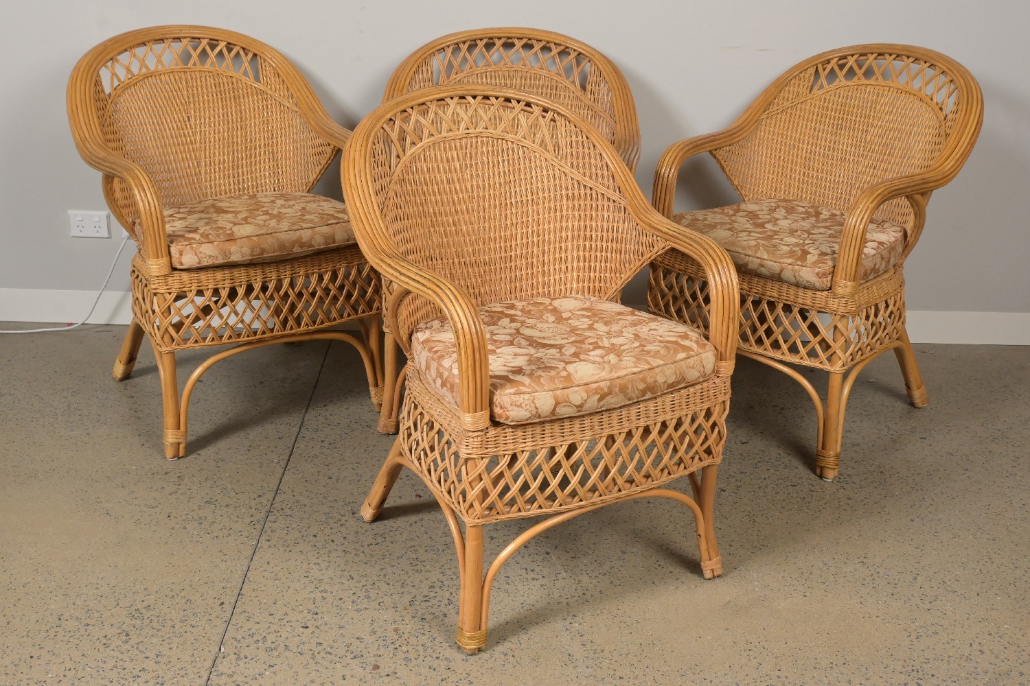 A SET OF FOUR CANE & WICKER ARMCHAIRS (91H X 63W X 70D CM) (LEONARD JOEL DELIVERY: X-LARGE)