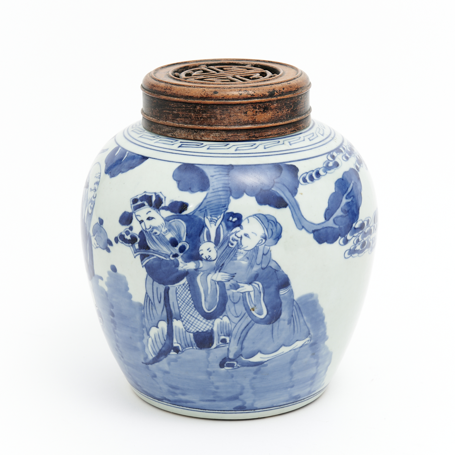 A CHINESE BLUE AND WHITE GINGER JAR WITH CARVED WOODEN COVER H.23CM, LEONARD JOEL DELIVERY SIZE: MEDIUM