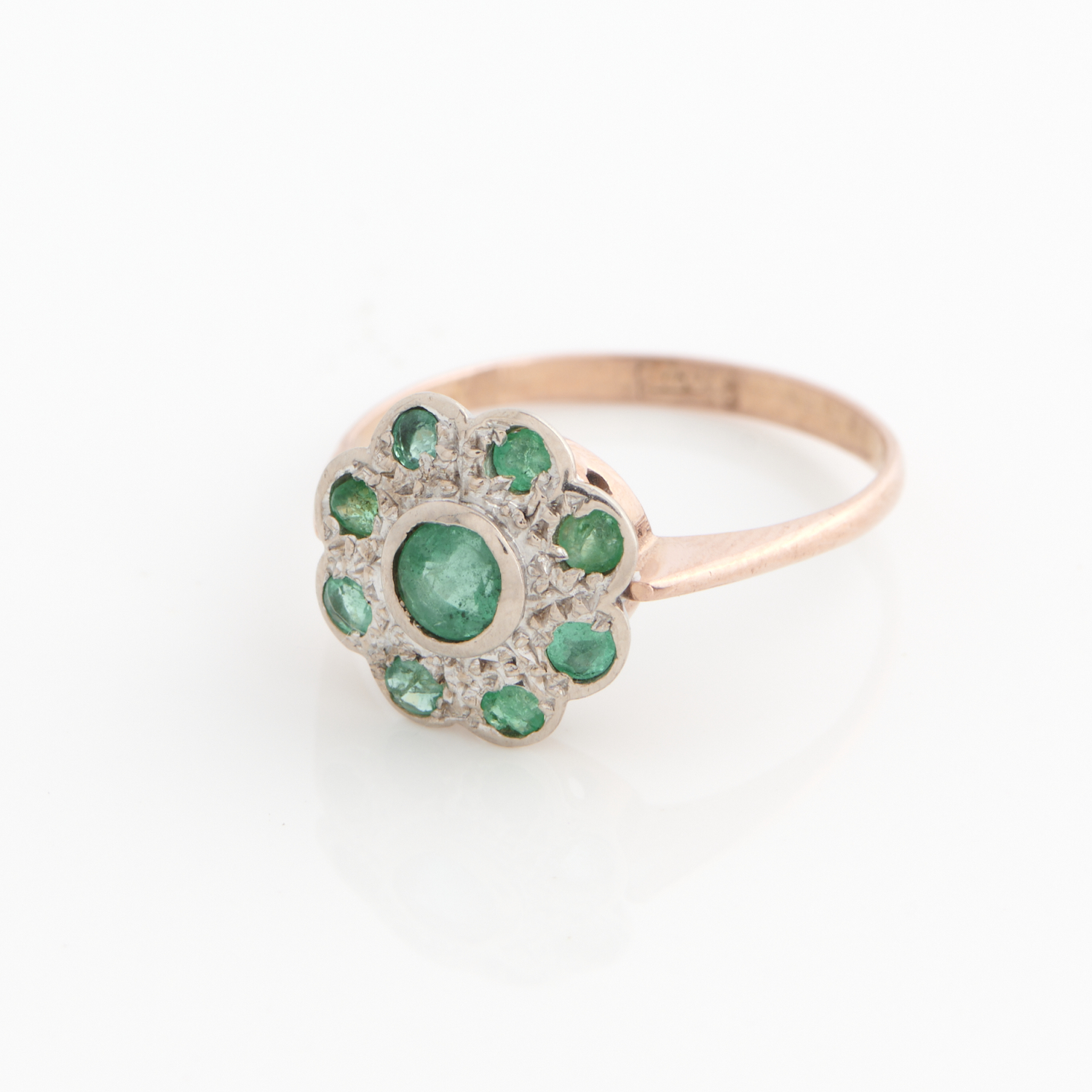 AN EMERALD CLUSTER RING IN 9CT TWO TONE GOLD, SIZE M 1/2, 1.8GMS