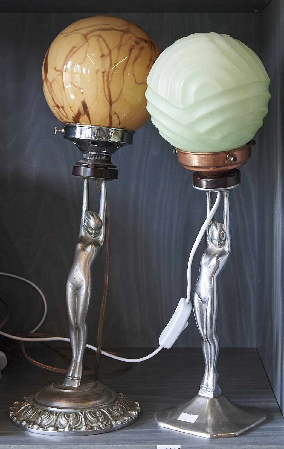 TWO ART DECO DIANA LAMPS WITH SPHERICAL GLASS SHADES H.48CM, LEONARD JOEL DELIVERY SIZE: MEDIUM