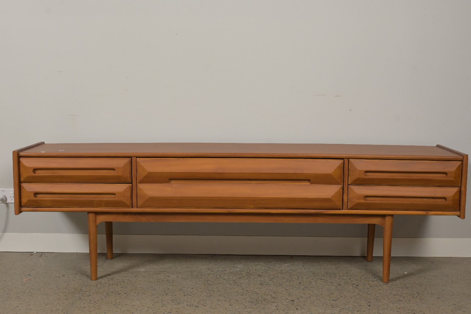 A TEAK LOW RISE SIDEBOARD (61H X 201W X 42D) (PLEASE NOTE THIS HEAVY ITEM MUST BE REMOVED BY CARRIERS AT THE CUSTOMER'S EXPENSE. LEONARD JOEL STAFF CANNOT ASSIST CARRYING THIS ITEM) (X-LARGE)