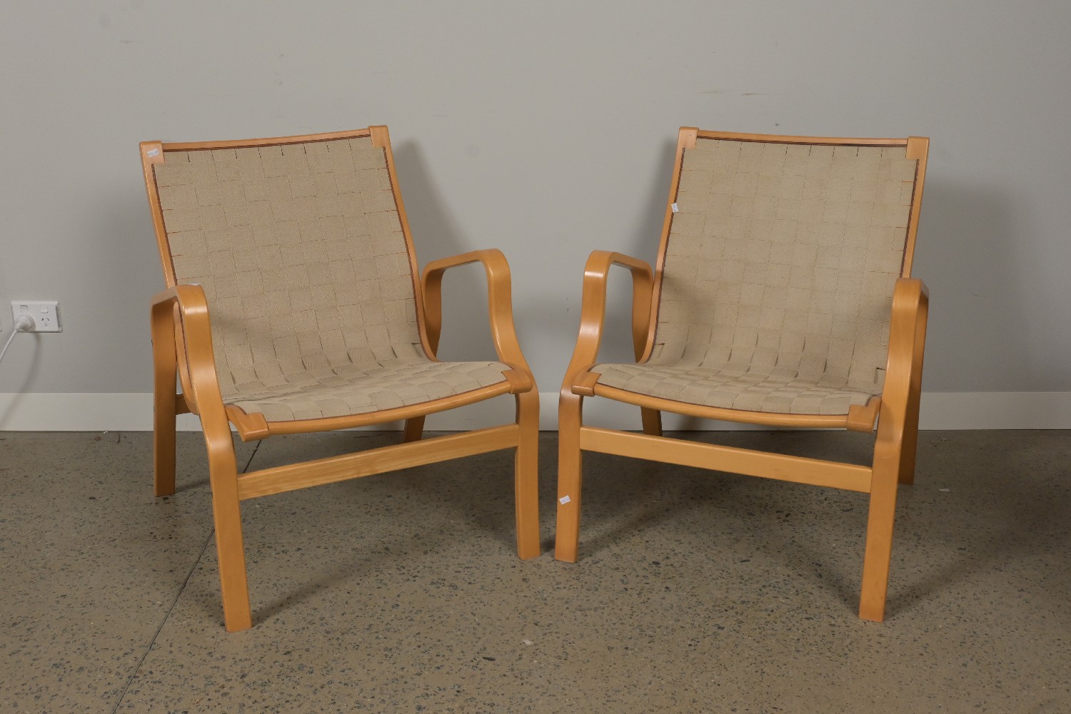 A PAIR OF DANISH BENTWOOD AND FABRIC ARMCHAIRS (79H X 63W X 75D CM) (LEONARD JOEL DELIVERY: X-LARGE)