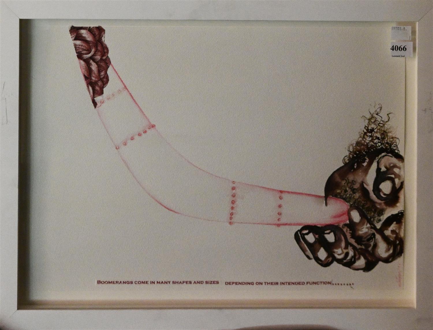MITHU SEN, BOOMERANGS COME IN MANY SHAPES AND SIZES DEPENDING ON THEIR INTENDED FUNCTION 2011, MIXED MEDIA ON PAPER, SIGNED AND DATED LOWER RIGHT, 29 X 41CM (SHEET), FRAME SIZE: 37 X 48CM