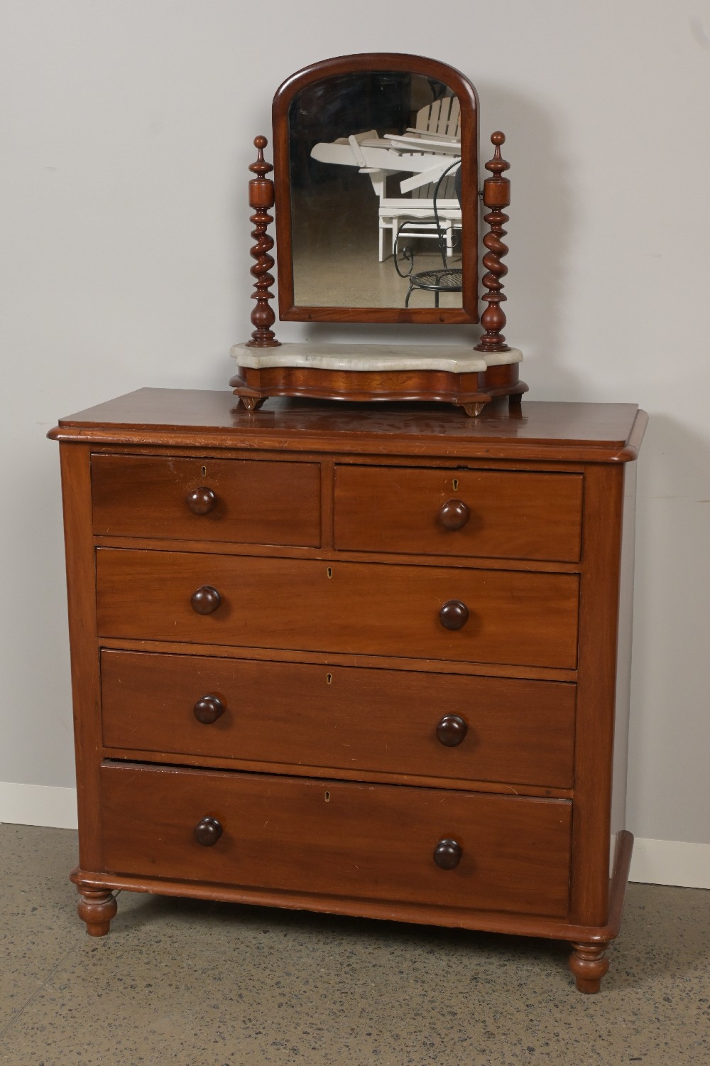 AN AUSTRALIAN CEDAR CHEST OF DRAWERS WITH TOILET MIRROR (A/F) 173H X 110W X 49D (TOTAL COMBINED HEIGHT) (PLEASE NOTE THIS HEAVY ITEM MUST BE REMOVED BY CARRIERS AT THE CUSTOMER'S EXPENSE. LEONARD JOEL STAFF CANNOT ASSIST CARRYING THIS ITEM) (X-LARGE)