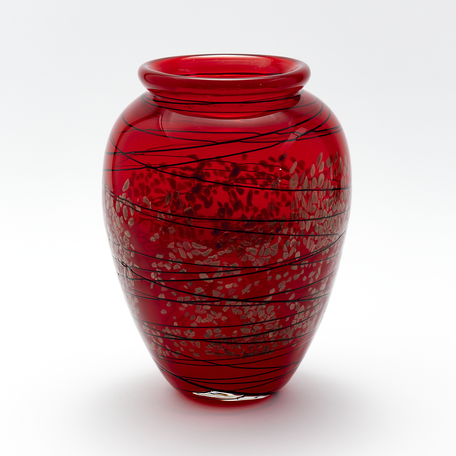 AN ITALIAN 1970S ART GLASS VASE WITH GOLD FOIL INCLUSIONS AND BLACK STRIPED PATTERN H.28CM, LEONARD JOEL DELIVERY SIZE: SMALL