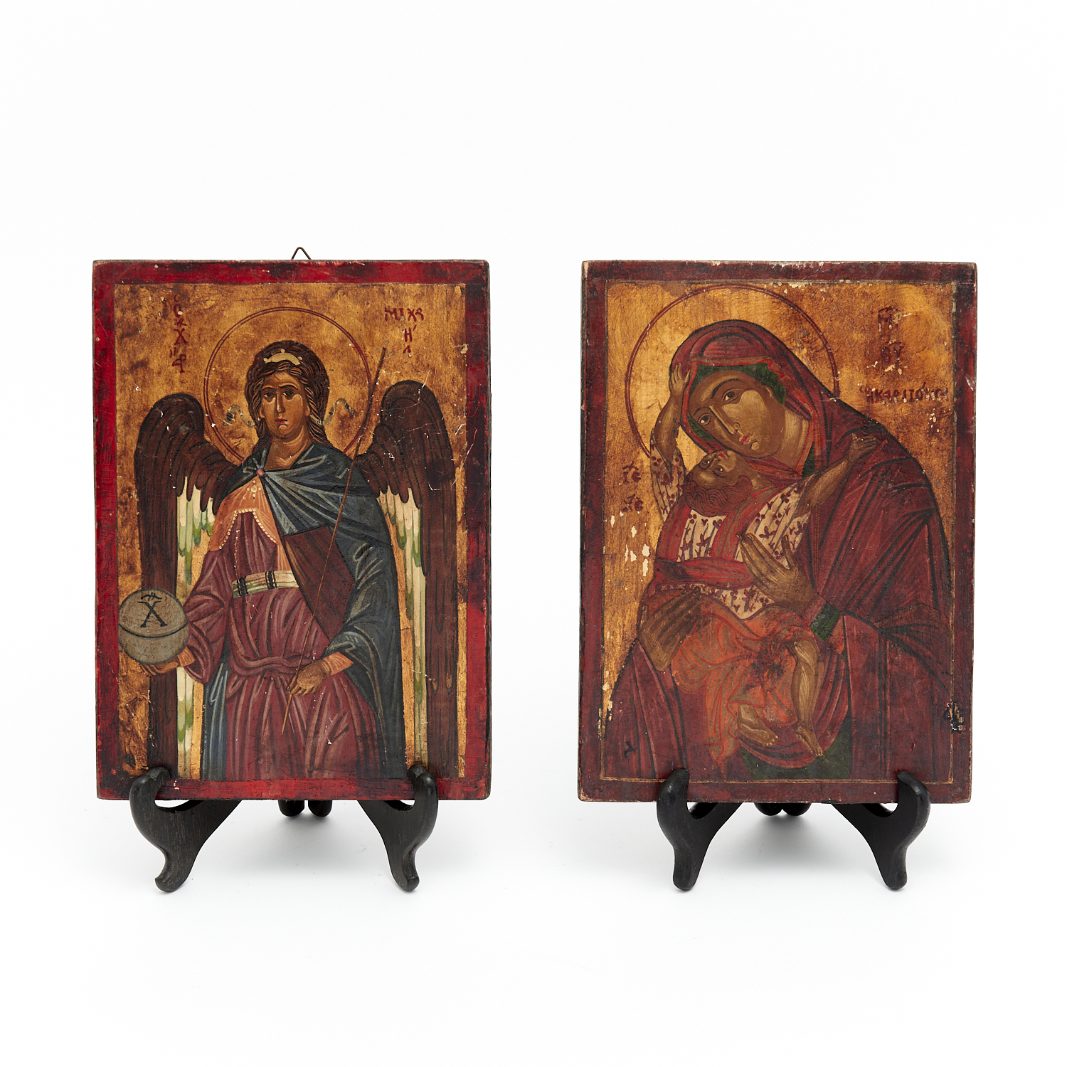 A PAIR OF HANDPAINTED ICONS ON WOODEN MOUNTS H.22CM, LEONARD JOEL DELIVERY SIZE: SMALL