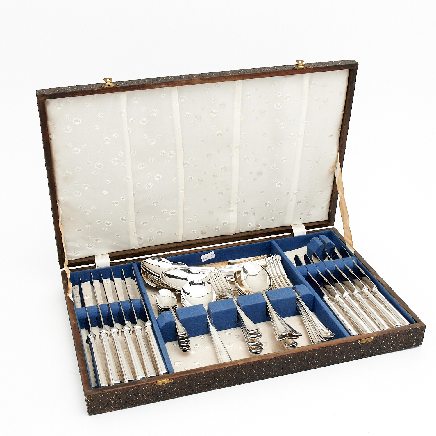 AN ART DECO STYLE BOXED SET OF SHEFFIELD ENGLISH SILVER PLATE AND STAINLESS STEEL BLADED CUTLERY FOR SIX WITH MANY EXTRAS W.45CM (BOX), LEONARD JOEL DELIVERY SIZE: LARGE
