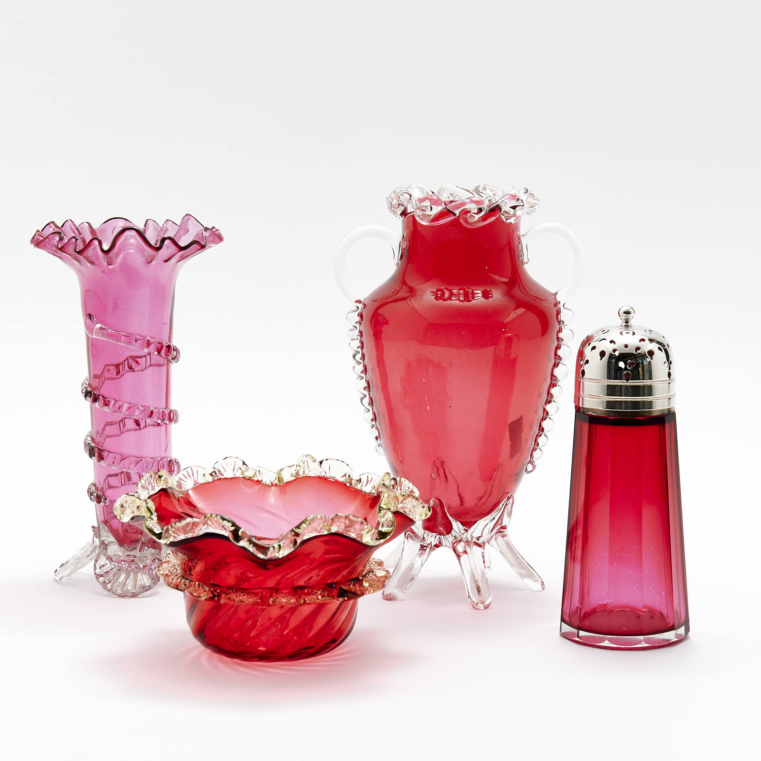 A COLLECTION OF FOUR RUBY GLASS FRILL EDGED VASES AND BOWLS ONE WITH URANIUM RIM AND SILVER TOPPED CASTOR SHAKER H.19CM (TALLEST), LEONARD JOEL DELIVERY SIZE: MEDIUM