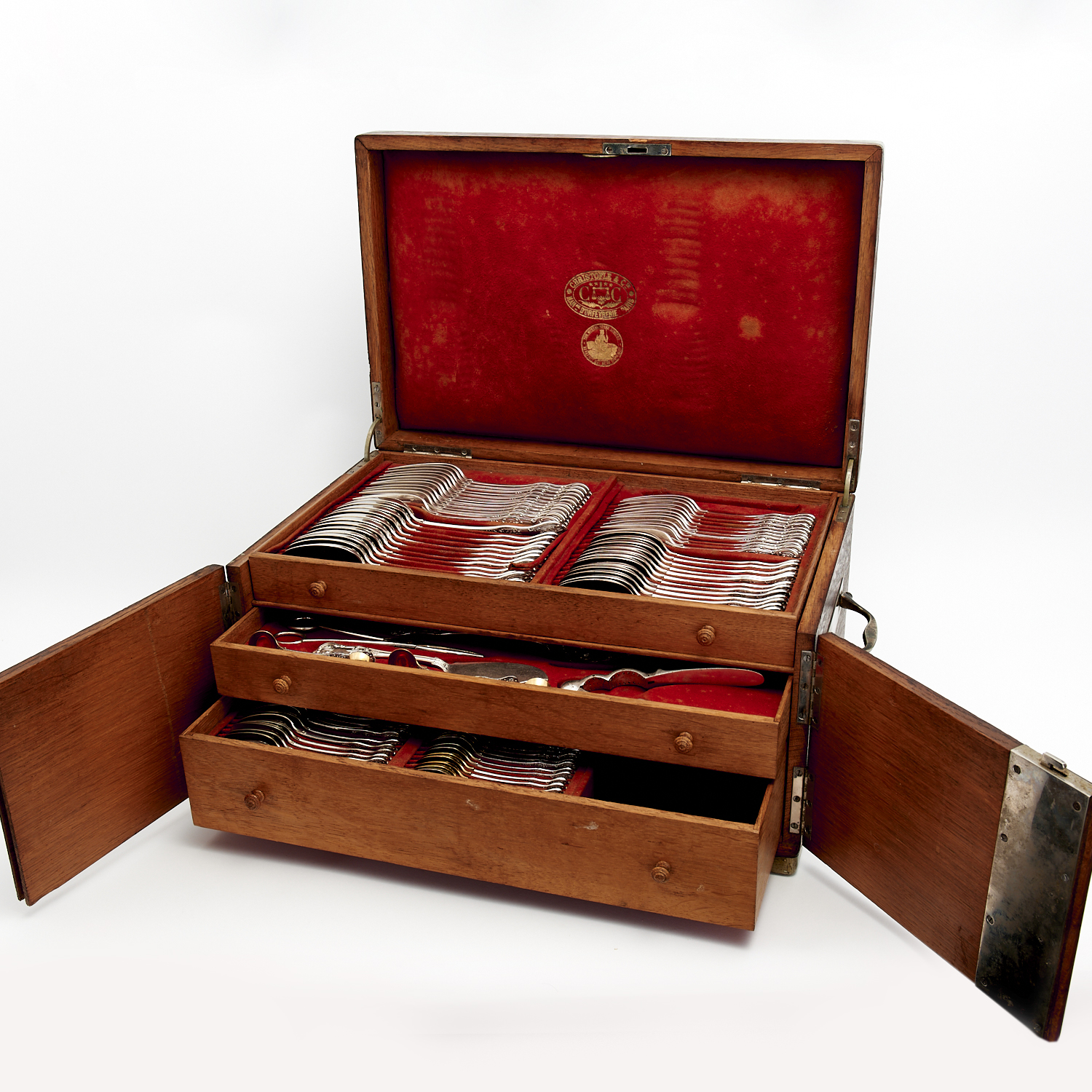 A CASED SET OF 19TH CENTURY CHRISTOFLE SILVER PLATE CUTLERY IN ORIGINAL CANTEEN WITH THREE SLIDE OUT DRAWERS W.49CM (BOX), LEONARD JOEL DELIVERY SIZE: X-LARGE