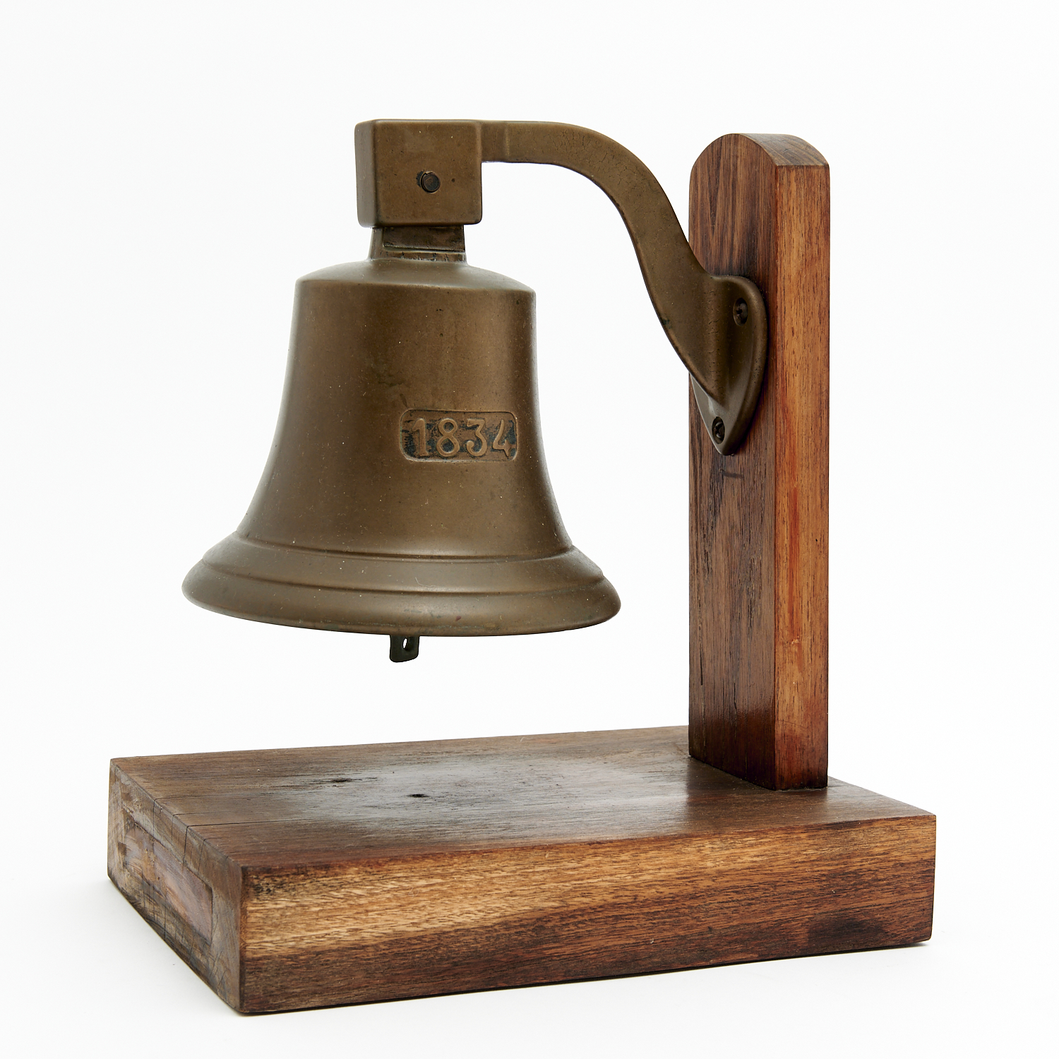 A LARGE WOODEN MOUNTED SOLID BRASS SHIPS BELL WITH IMPRESSED YEAR DATE, 1834 DIA.16CM (BELL), LEONARD JOEL DELIVERY SIZE: LARGE