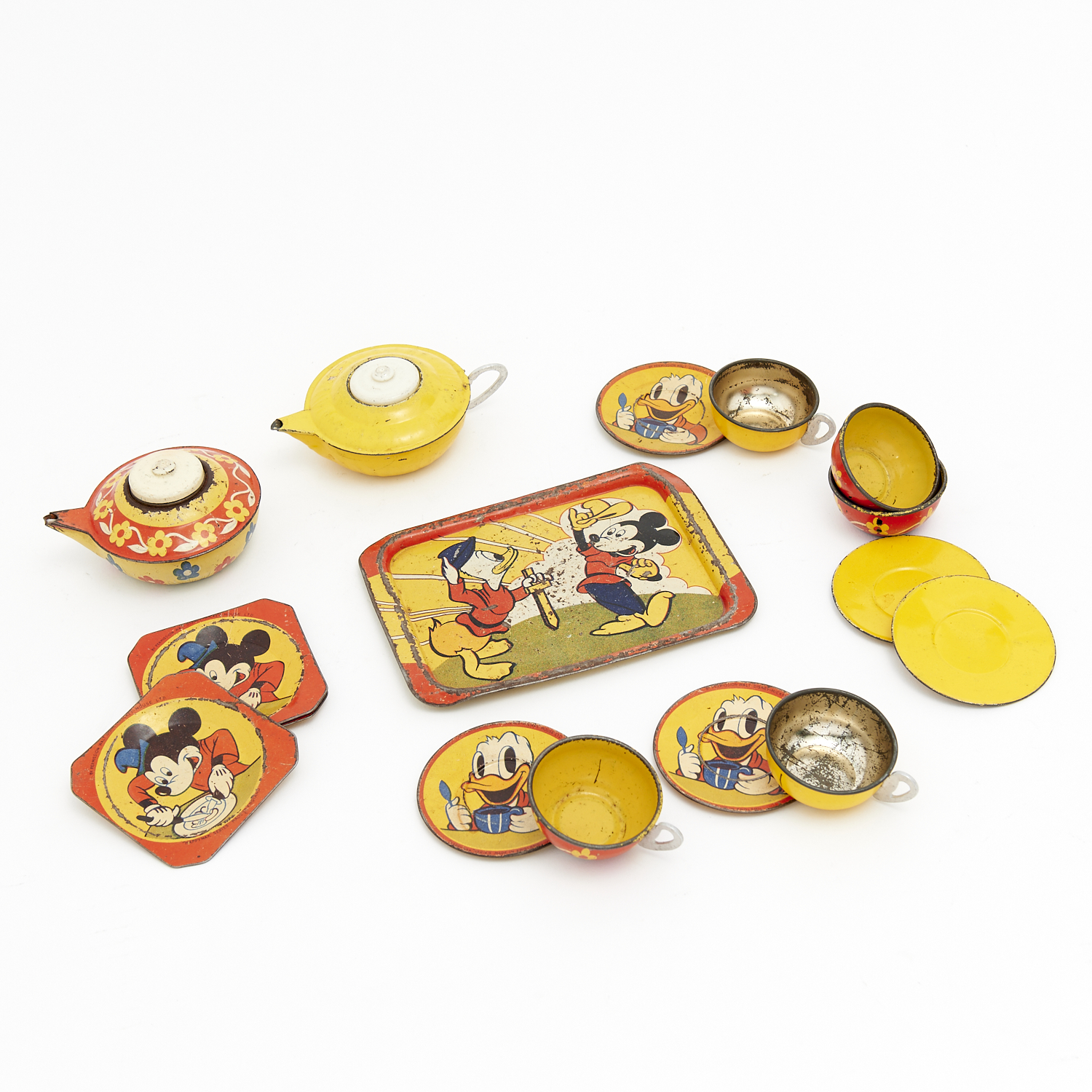 A 1920S ENGLISH MADE HAPPYNAK SERIES DISNEY TRANSFER TIN CHILDS PICNIC SET L.14.5CM (LARGEST), LEONARD JOEL DELIVERY SIZE: SMALL