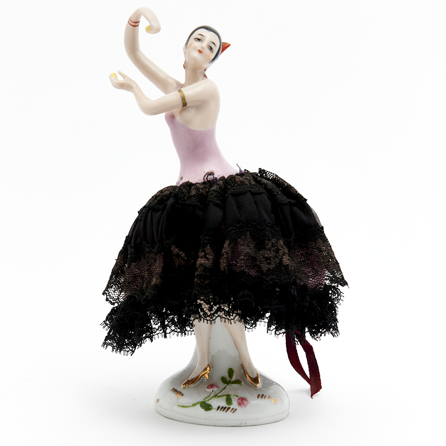 A GERMAN ART DECO HAND PAINTED COSY DOLL WITH SKIRT AND ORIGINAL STANDING LEGS H.19.5CM, LEONARD JOEL DELIVERY SIZE: MEDIUM