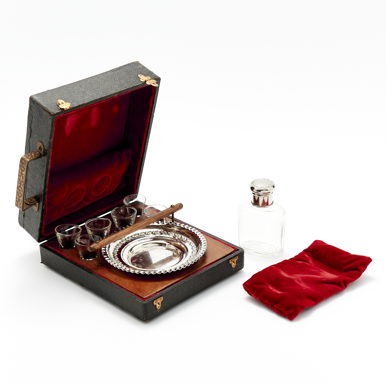 A 19TH CENTURY FRENCH LEATHER CASED TRAVELLING PRIESTS COMMUNION SET W.20CM, LEONARD JOEL DELIVERY SIZE: SMALL