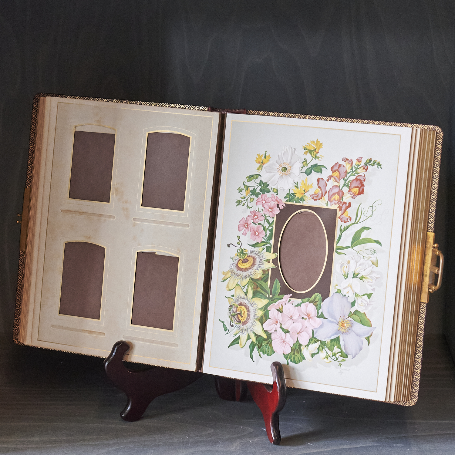 A 19TH CENTURY ENGLISH LEATHER BOUND PHOTO ALBUM WITH BEAUTIFULLY COLOURED PAGES AND ORIGINAL GUILDED BRASS LATCH H.29.5CM, LEONARD JOEL DELIVERY SIZE: MEDIUM