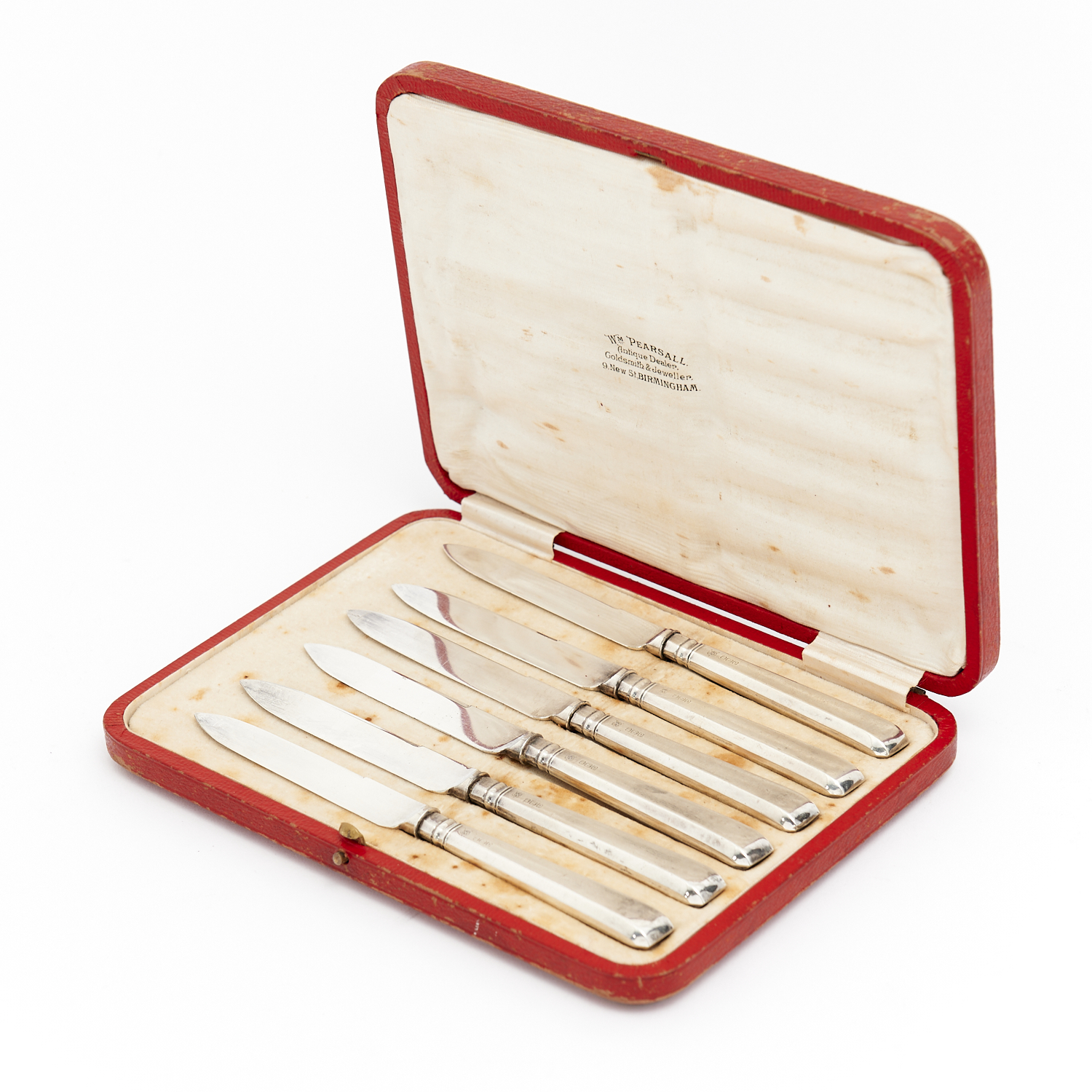 A CASED SET OF ENGLISH HALLMARKED STERLING SILVER FRUIT KNIVES L.17CM (KNIFE), LEONARD JOEL DELIVERY SIZE: SMALL