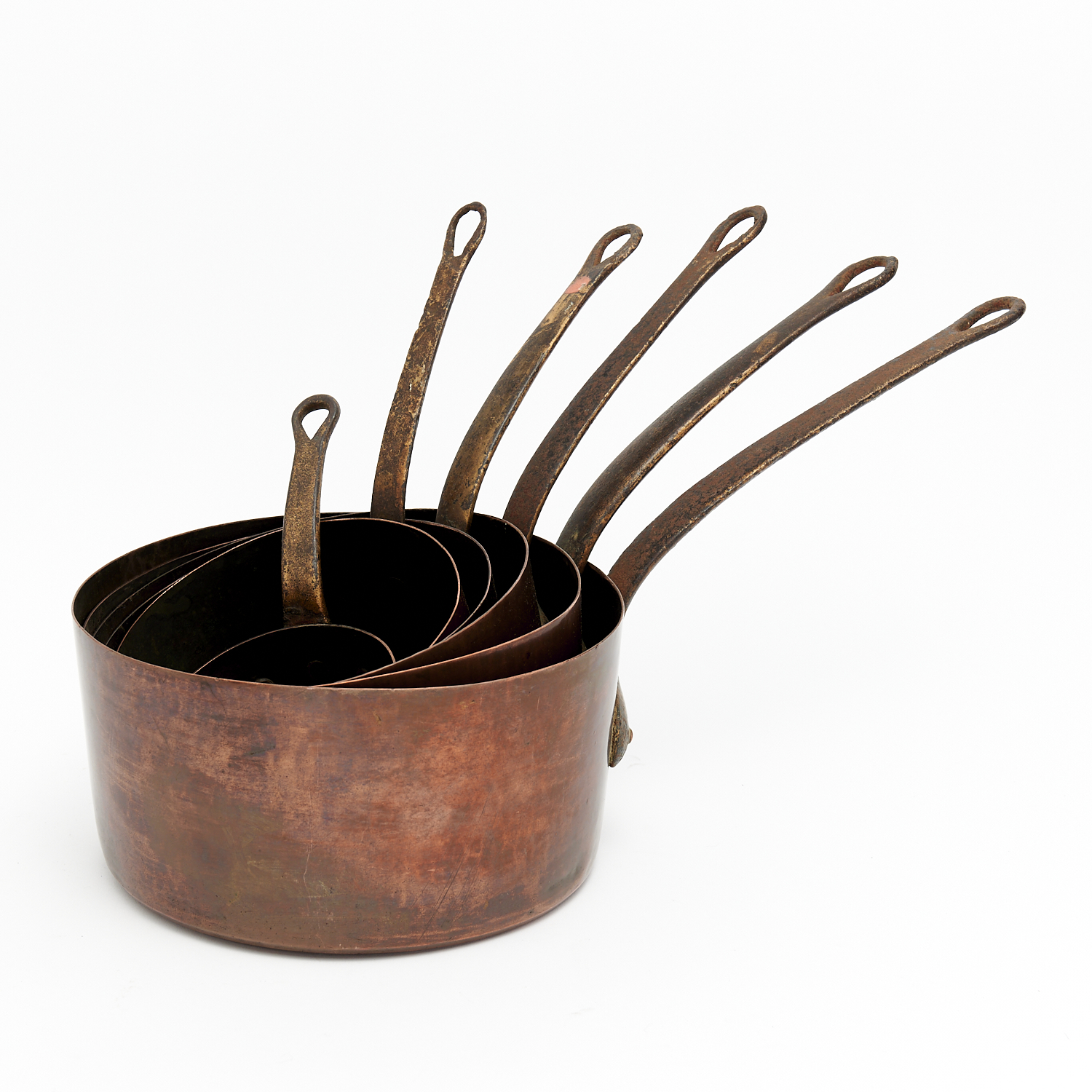 AN ORIGINAL SET OF SIX GRADUATED 19TH CENTURY FRENCH SOLID, COPPER AND CAST-IRON HANDLED SAUCEPANS DIA.26CM (LARGEST), LEONARD JOEL DELIVERY SIZE: LARGE
