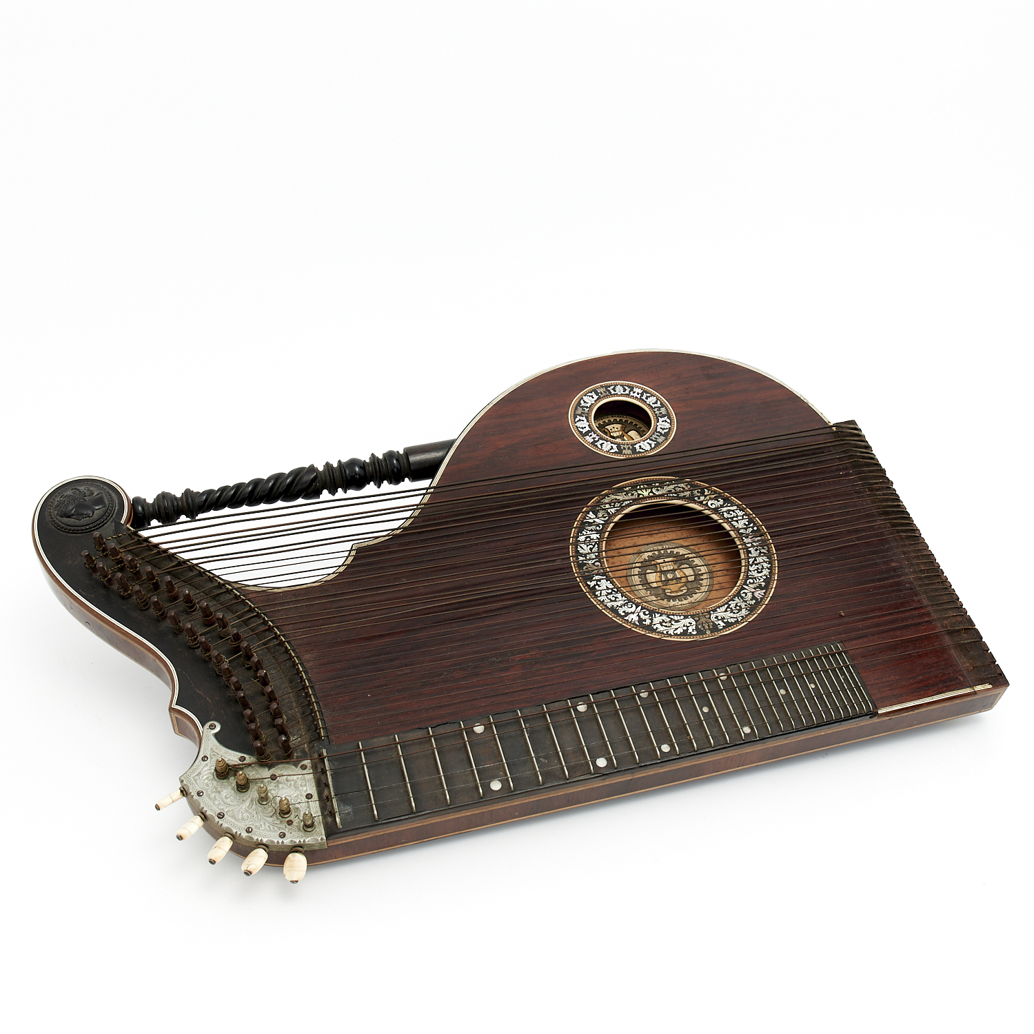 A ROSEWOOD AND MOTHER-OF-PEARL INLAID GSM FABRIK MARKE ZITHER L.59CM, LEONARD JOEL DELIVERY SIZE: LARGE