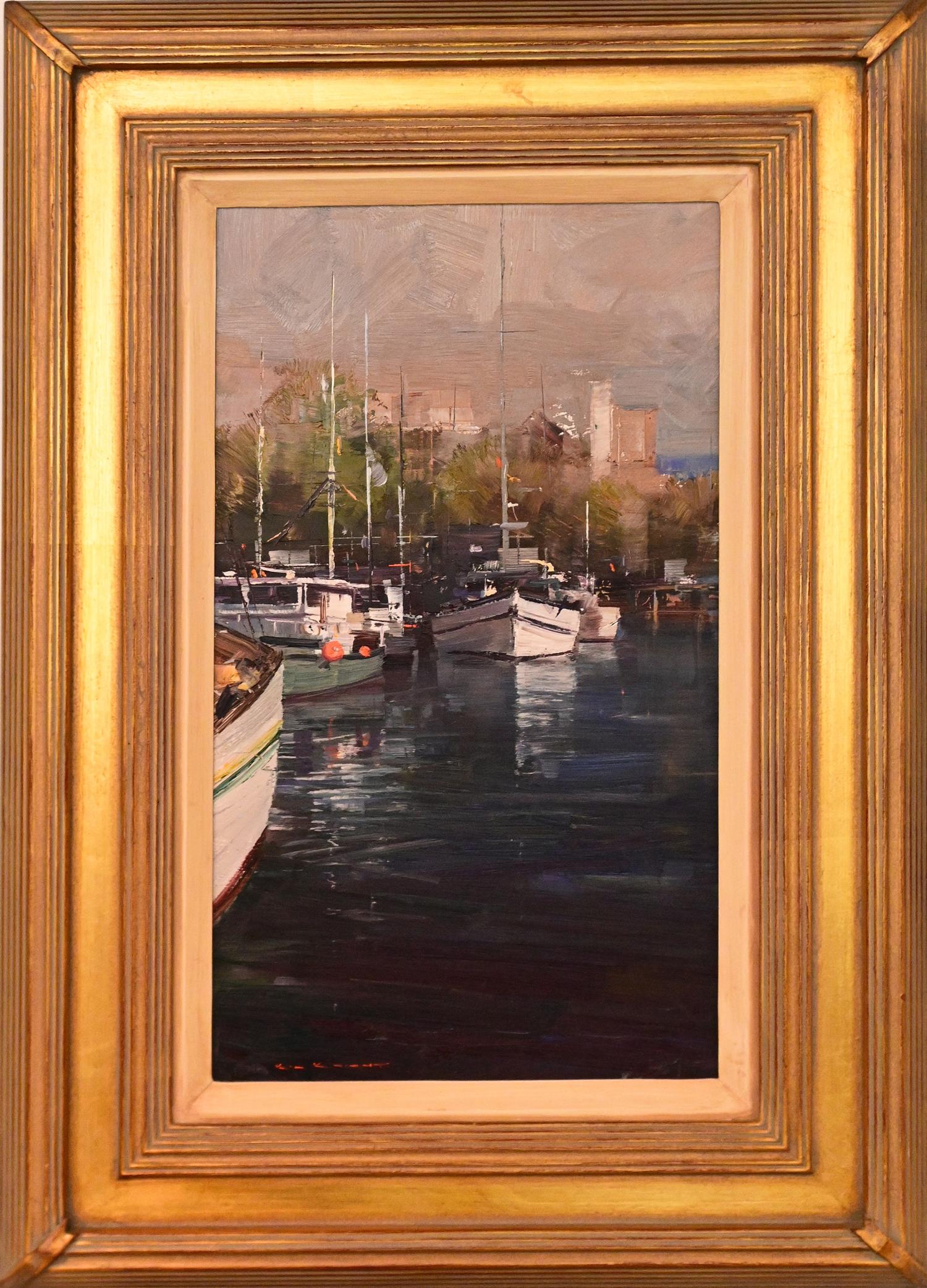 KEN KNIGHT, CONSTITUTION DOCK, HOBART, OIL ON BOARD, SIGNED LOWER LEFT, 48 X 27.5CM, FRAME SIZE: 70 X 51CM