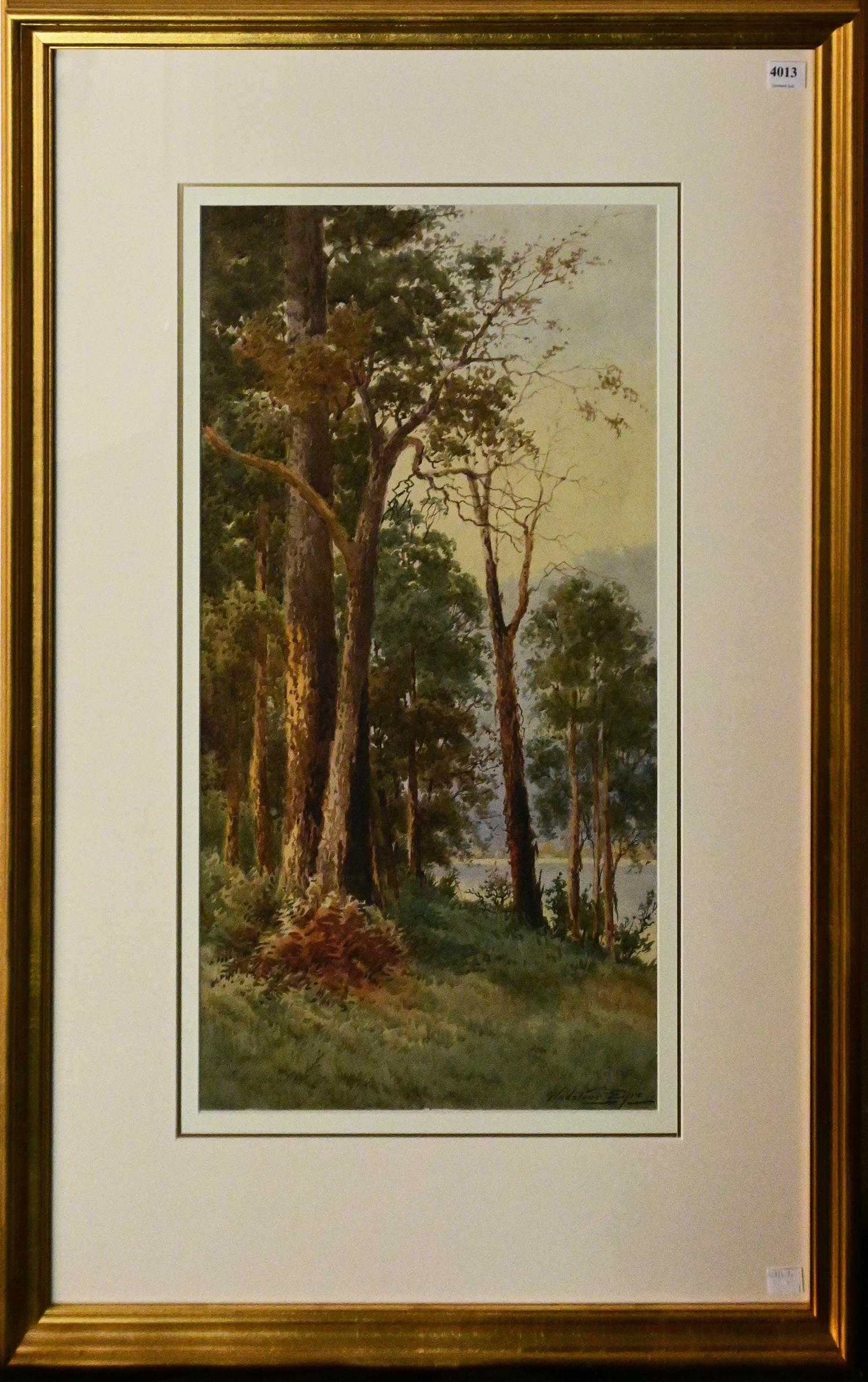 GLADSTONE EYRE, (GUM TREES BY A RIVER), WATERCOLOUR ON PAPER, SIGNED LOWER RIGHT, 58 X 30.5CM, FRAME SIZE: 87 X 58.5CM